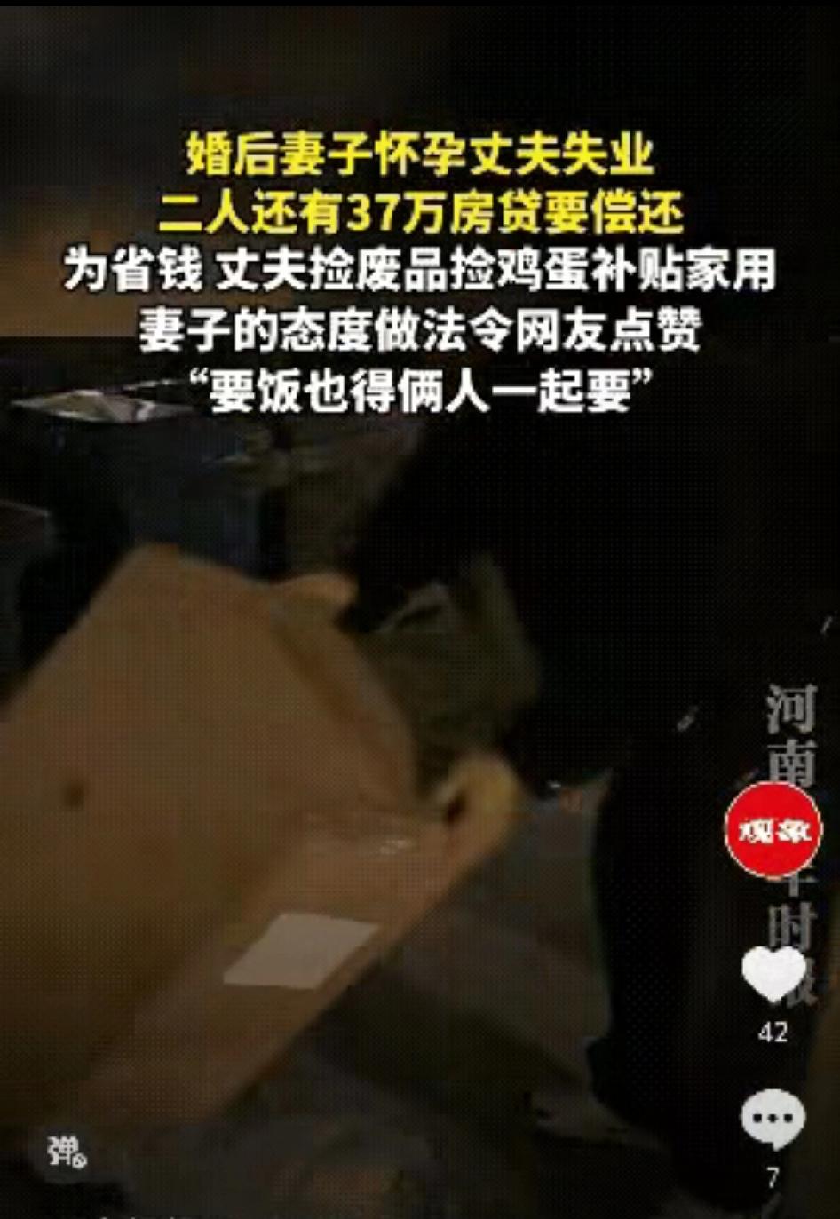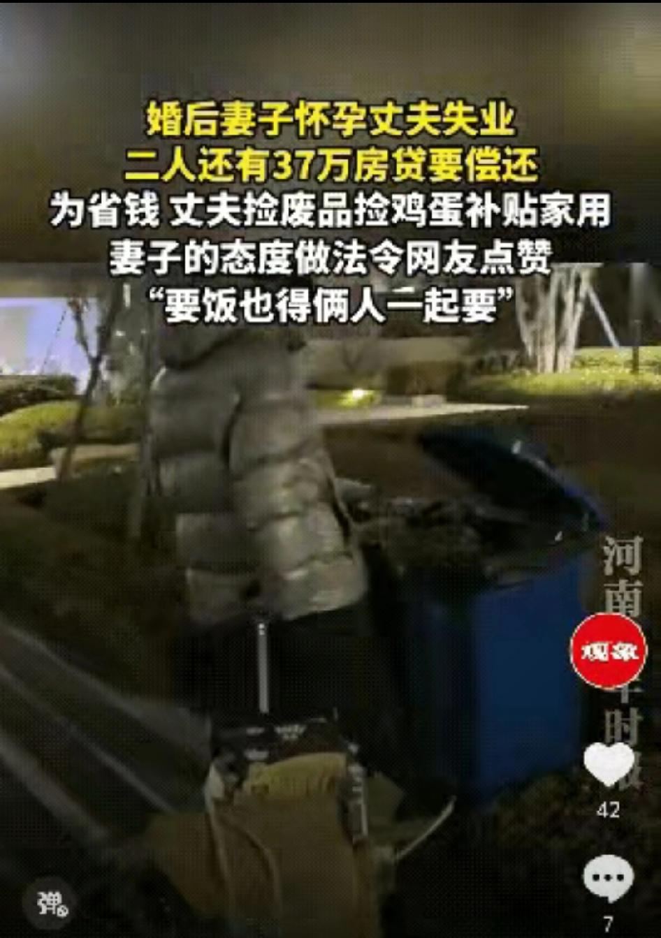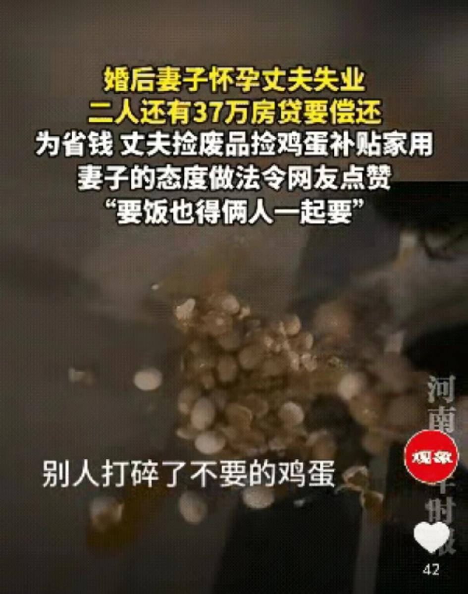 “太佩服了!”辽宁,一男子婚后失业,还有37万房贷要还,老婆此时又怀孕,为了省钱,捡废品,捡鸡蛋,老婆没有抱怨和嫌弃,选择和老公一起承担,网友:有这样的老婆,就算生活再难都不会被打败… 2026年3月29日,辽宁一段路灯下的短视频,戳中了无数普通人的泪点。 一对刚结婚不到两年的小夫妻,正遭遇人生最难的一关。 妻子怀孕6个月,肚子一天天大起来,需要营养、需要休息、需要有人照顾。可偏偏在这个节骨眼,丈夫失业了。家里唯一的收入断了,可37万的房贷一分不能少,每个月两千多的月供,像块石头压在胸口。 双方父母都是普通人家,身体不算好,平时还要小两口贴补。他们不敢跟老人说,怕家里担心,更不想伸手要钱,所有压力,只能两个人自己扛。 那段日子,男人整夜睡不着。 看着妻子日渐隆起的肚子,看着每月到期的账单,他心里又急又愧。曾经他也想体面,想给妻儿安稳的生活,可生活突然塌下来,面子在生存面前,一文不值。 为了让妻子能吃上口有营养的,他开始放下面子,上街捡废品。 他专挑傍晚出门,避开熟人,低着头在垃圾桶旁翻找,纸壳、塑料瓶、废纸箱,一点点捆起来,能卖一块是一块。 最让人心酸的,是他捡鸡蛋的样子。 看到路边有人打碎的鸡蛋,他会蹲下来,仔细挑出还完好的蛋液,小心翼翼装进干净盒子里,捧在手里往家走,嘴里轻轻叹一句:“哎,都是好的哎,扔了可惜,带回家给你补营养。” 他不是穷酸,不是抠门,是真的没辙了。 他想给妻子买最新鲜的蛋、最嫩的肉,可他掏不出钱。他只能用这种最卑微、最让人心疼的方式,尽力护着怀孕的妻子。 换作别的女人,可能早就抱怨、委屈、甚至崩溃。 可她没有。 她挺着大肚子,安安静静陪在他身边,帮他整理纸壳,帮他捆扎废品,路灯把两个人的影子拉得很长。她脸上始终带着笑,没有嫌弃,没有指责,没有一句埋怨。 丈夫心里难受,觉得自己没本事,让她跟着受苦。 她却轻轻说:“怕啥,要饭也得俩人一起要。” 一句话,轻得像风,却重得能撑起一个家。 她不是不害怕,不是不焦虑。夜深人静,她也偷偷抹过眼泪,想到未出生的孩子,想到遥遥无期的房贷,想到丈夫疲惫的眼神,她也心慌。可她更明白,男人已经在拼命撑着,她不能再倒,不能再给他添压力。 他以前疼她、护她,从不让她受委屈。 现在他难了,她就站出来,陪他一起扛。 他们在路灯下收拾废品,有说有笑,互相打气。 男人把卖废品的几十块钱,小心地交给妻子,她默默收好,一分都舍不得花,全都存着,留着产检、留着生孩子、留着给这个家一点点希望。 视频传开后,全网都看破防了。 有人说,这才是婚姻最好的样子:不是大富大贵,而是落魄时不撒手,风雨里一起走。 有人说,男人放下尊严捡废品,是最爷们的担当;女人笑着陪伴,是最难得的温柔。 他们没有抱怨命运,没有逃避责任,没有啃老,没有躺平,更没有走歪路。 男人用最卑微的方式扛起家,女人用最温柔的态度守住家。 日子再苦,他们没丢良心,没丢体面,没丢彼此。 这世上最好的家,从来不是钱多钱少。 而是你难,我不怨;你苦,我陪你; 风雨来了,我们一起扛,不松手、不放弃。 愿这对善良又坚韧的夫妻,早日渡过难关, 愿每一个认真生活的人,都能被生活温柔以待。 分享每日正能量 消息来源:网络公开内容,本文配图/视频素材来自网络,仅用于纪实分享与社会观察,如有侵权请联系删除,谢谢!
