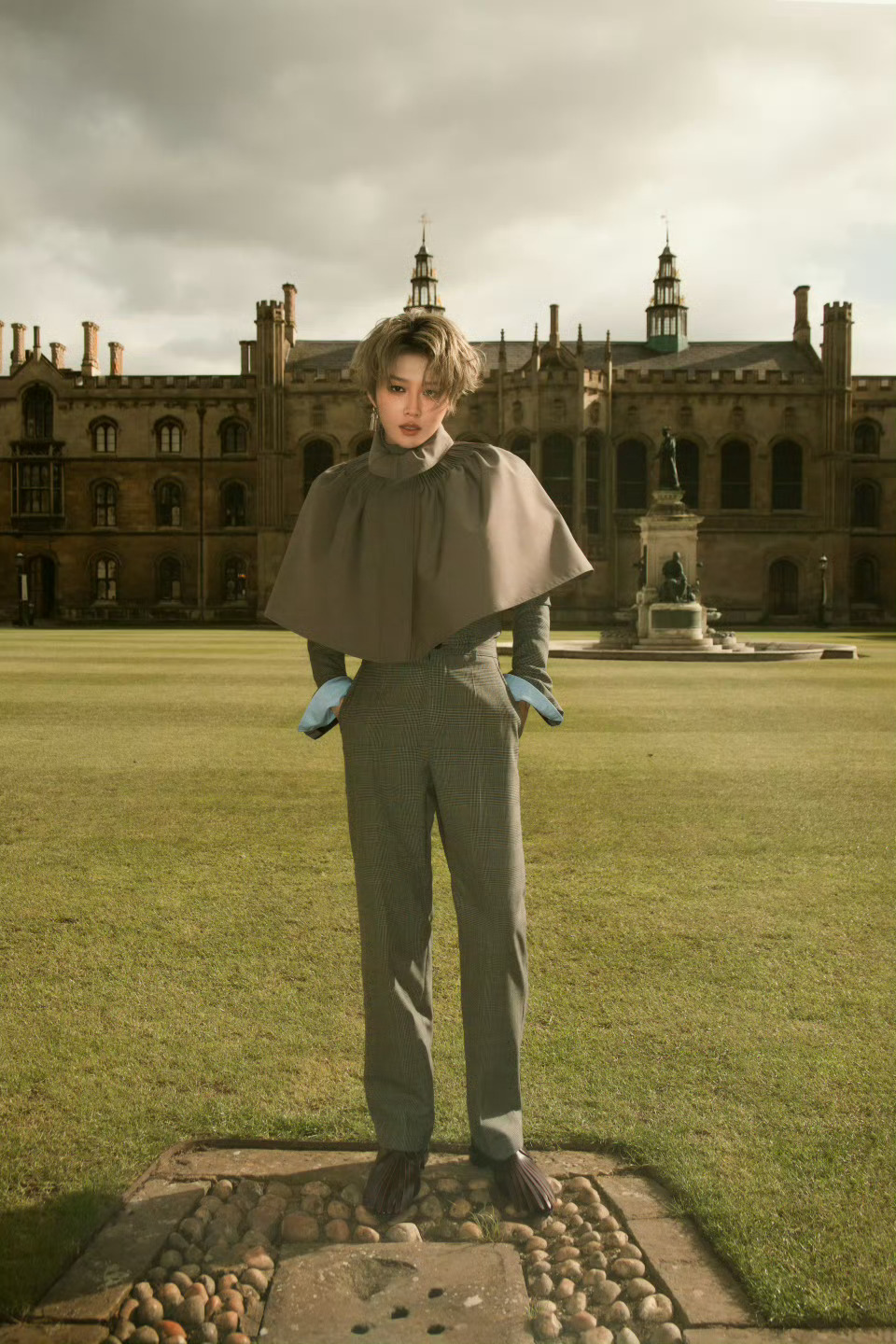 前脚空降出任KENT & CURWEN全球品牌大使,又火速亮相伦敦品牌百年大秀,廓形斗篷配同色系裤装,刘雨昕看秀造型够时髦