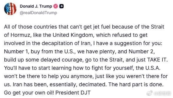 「所有那些因為霍爾木茲海峽而無法獲得航空燃油的國家,例如拒絕參與伊朗『斬首行動』的英國,我給你們一個建議: