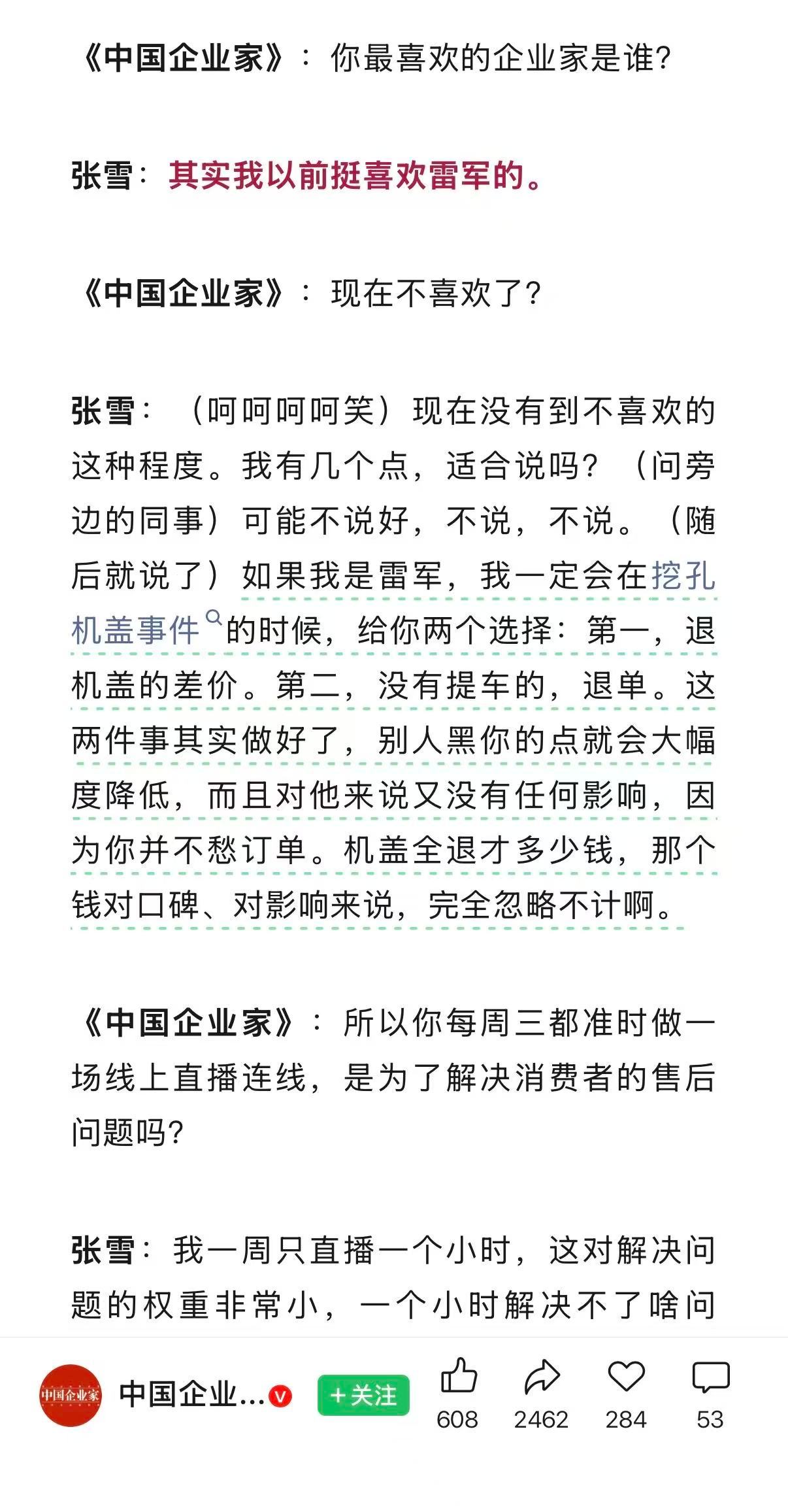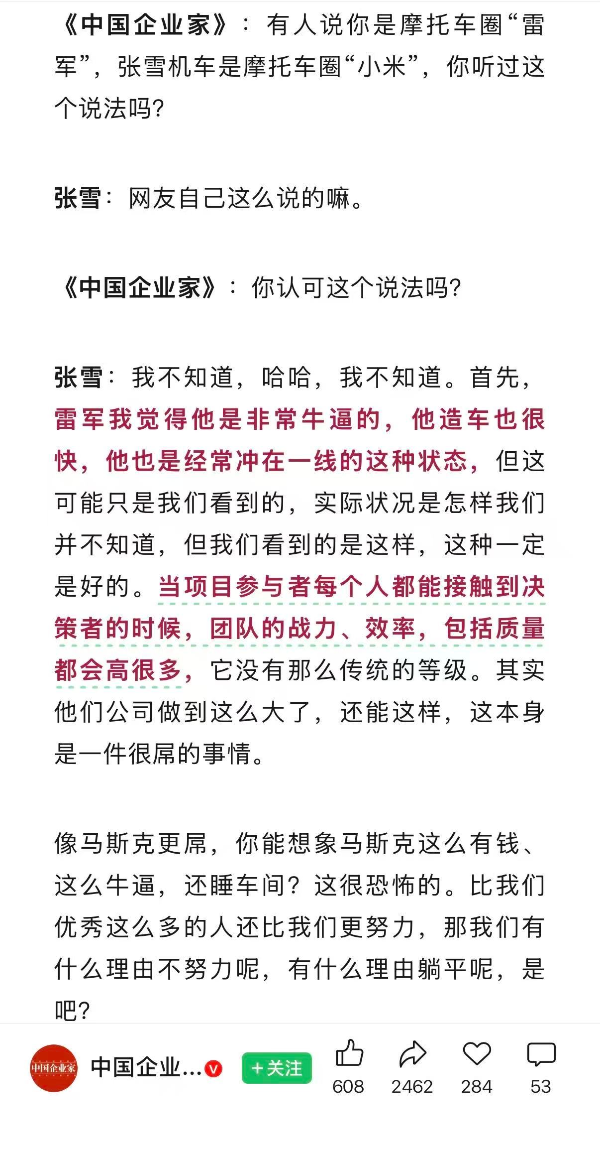 其实看完采访就知道,张雪张雪谈雷军与挖孔机盖事件本身没有恶意,只是站在用户角度觉得口碑更重要,而且人家也说了这些大佬们的拼命精神值得学习。