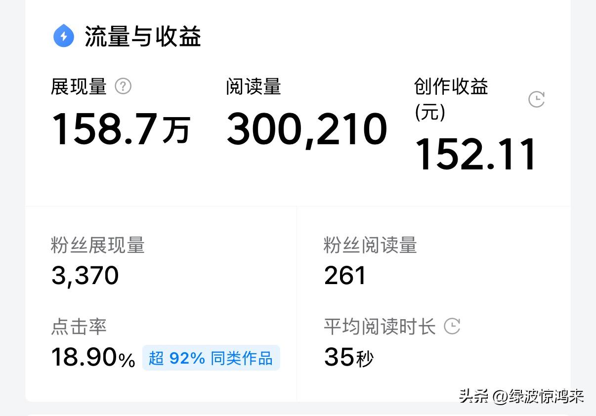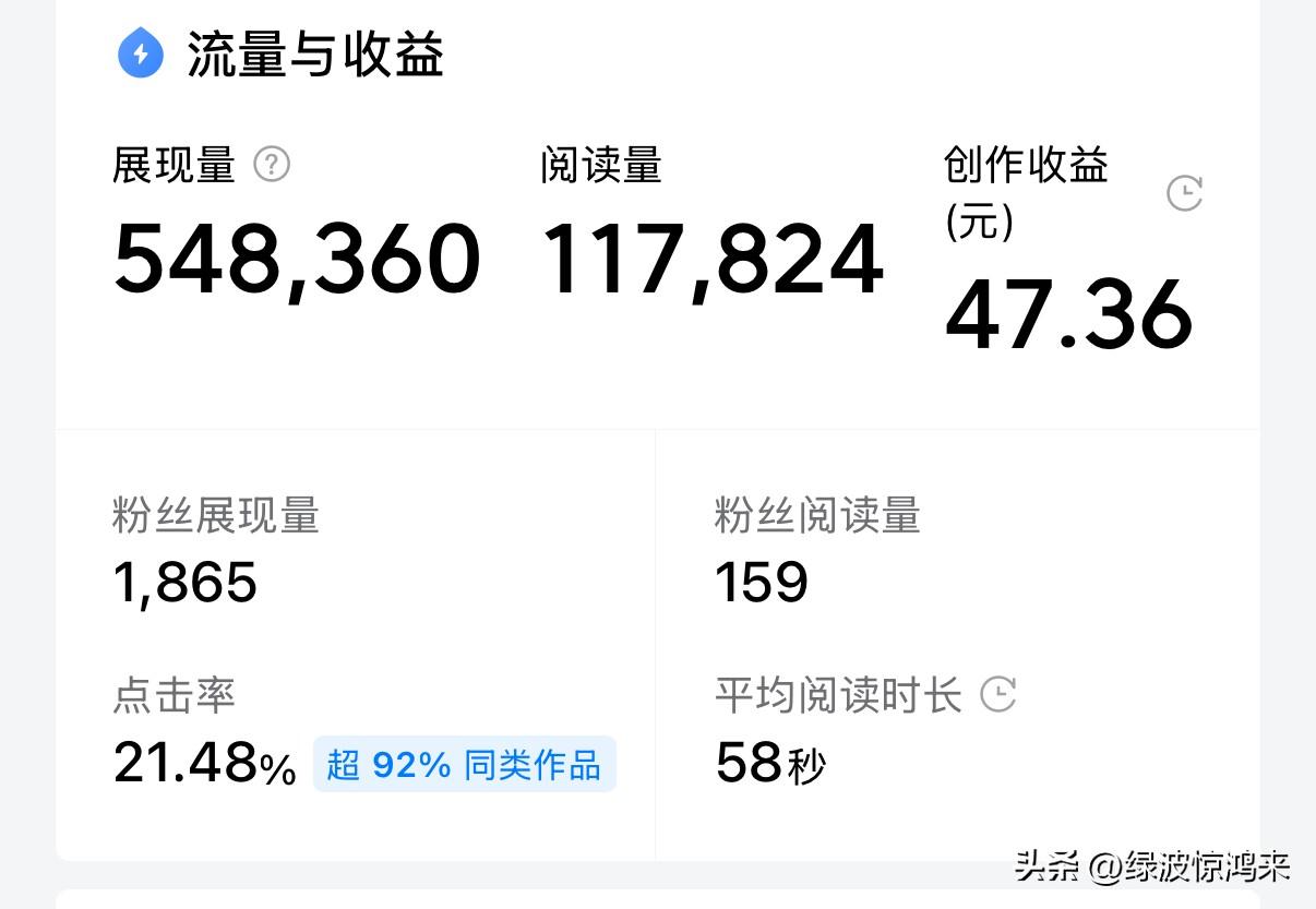 头条写作的收益,真是跌宕起伏,让人欢喜让人忧!现罗列几个有代表性的作品来作比较![捂脸] 去年七月,一篇爆款23万阅读,到手325元,折算下来万次阅读16块多! 到了十月,30万+阅读,只拿了152元,万次阅读跌到5块! 前几天,11.8万阅读,收益47.36元,万次阅读只剩4块出头……! 阅读量在涨,收益却一路往下掉。同样的平台,同样的写作,差距怎么就这么大? 有人说规则变了,有人说赛道挤了,可到底卡在哪,谁也给不出准话! 想在头条靠写作赚点钱,是不是真的越来越难了?这背后的门道,谁能给说道说道?
