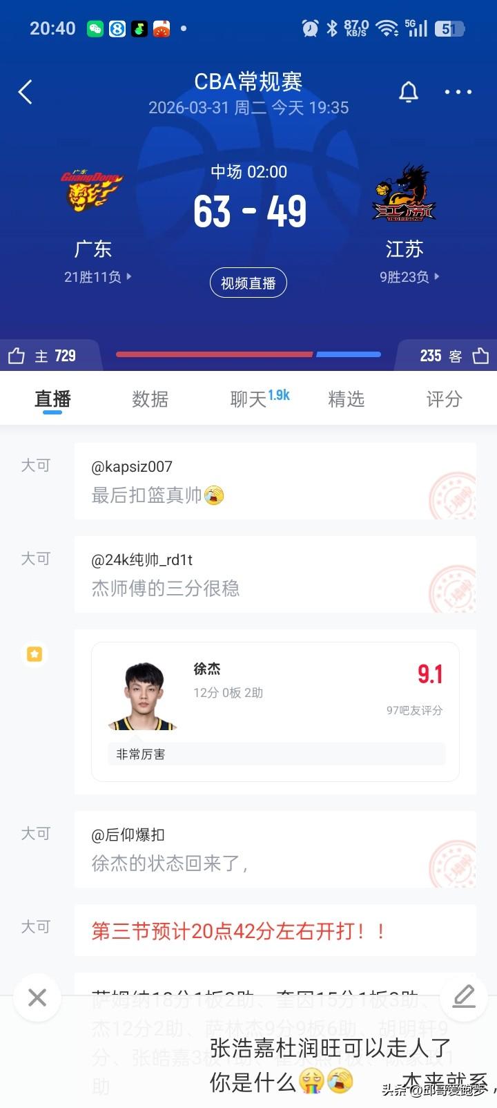 广东半场领先江苏14分… 说实话这比分还真有点出乎意料,第一节让江苏拿到32分!领先广东4分!江苏打的真好!进攻完全打开,特别是贾尔斯和亨特第一节发挥厉害!大炮刘正清第一节投进2记三分!最多时候领先广东10分! 结果第二节风云突变,小胡的上场吹响了广东的进攻高潮!小胡手感终于好了,投进2记关键三分,还有徐师傅,三分终于也开了…三分4投2中!加上萨姆纳和奎因,广东第二节利用防守让江苏命中率下降很厉害,第二节只让江苏拿了17分!而广东拿了35分。两队更打一节好球。 不过在广东的主场,又领先14分,江苏这场球不好打了!下半场老六要站出来,还有吴宇佳半场没有拿分。贾尔斯和亨特不能老是这么高效!广东比赛 宏远实力 宏远篮球CBA 宏远梯队