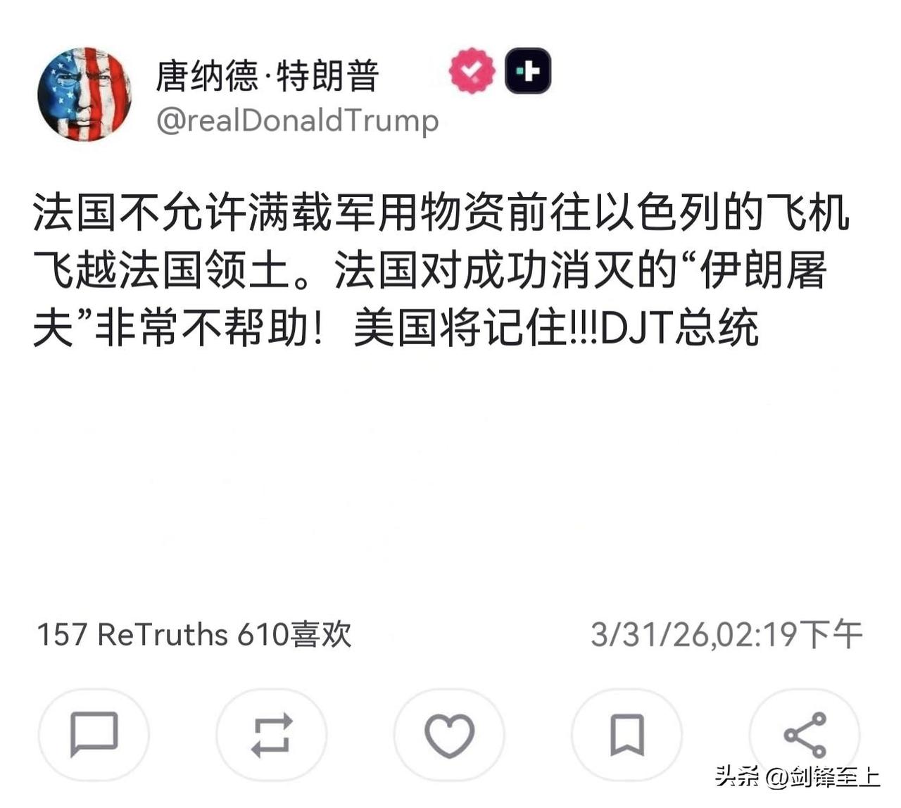 懂王心碎了! 特朗普表示:法国居然禁止运输军用物资的美国飞机飞跃领空前往以色列! 得道多助,失道寡助,懂王什么都懂,就是不懂历史!