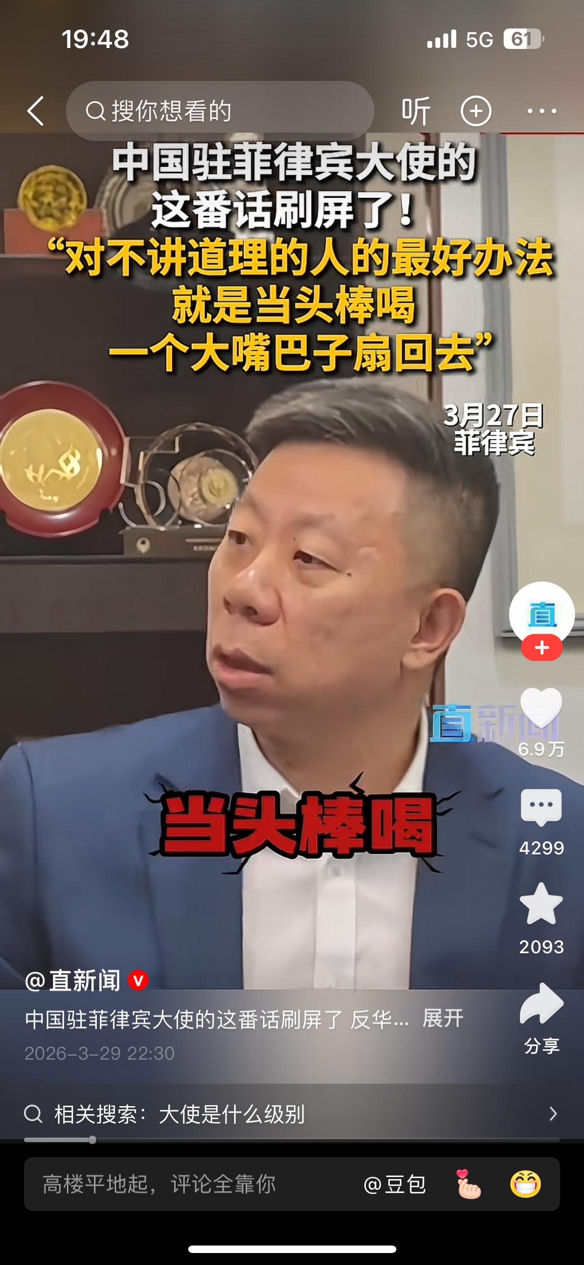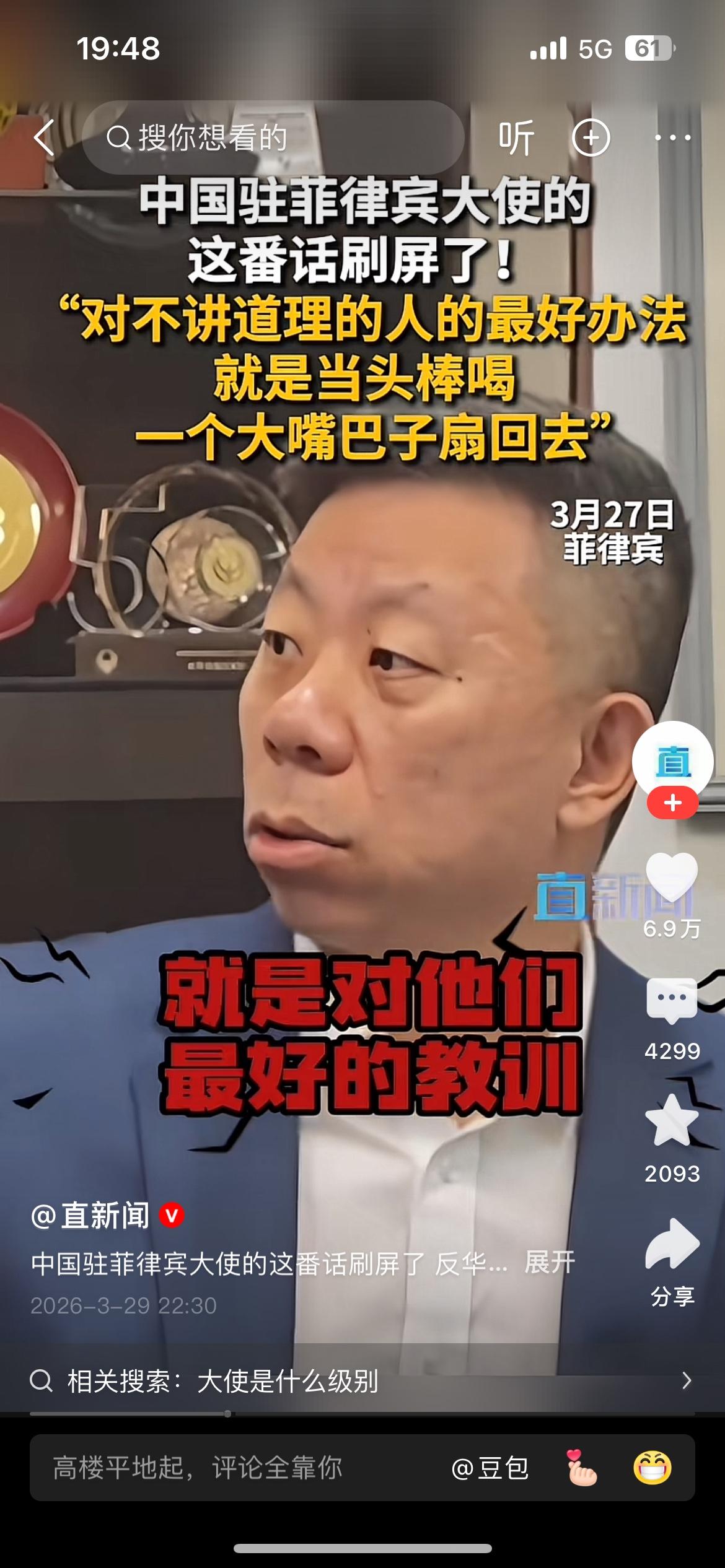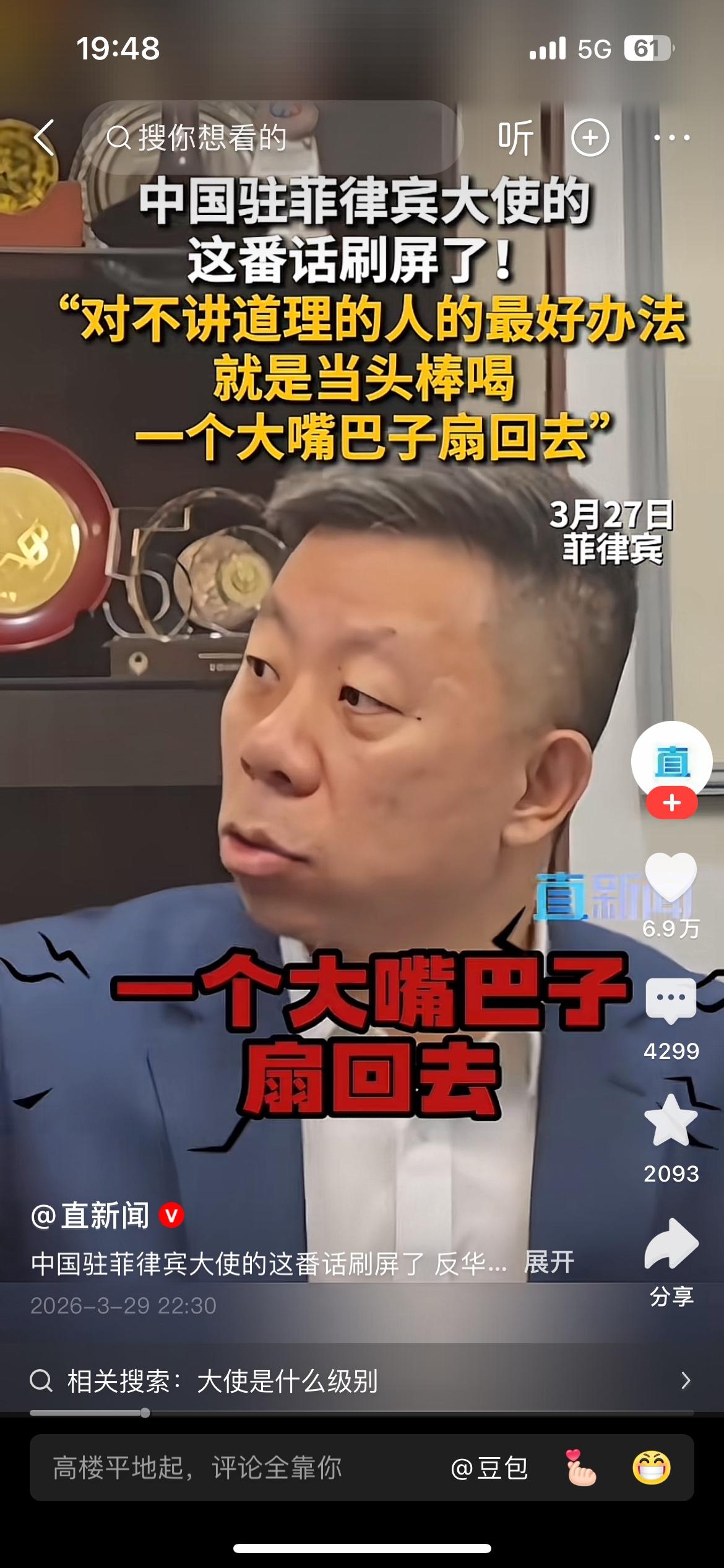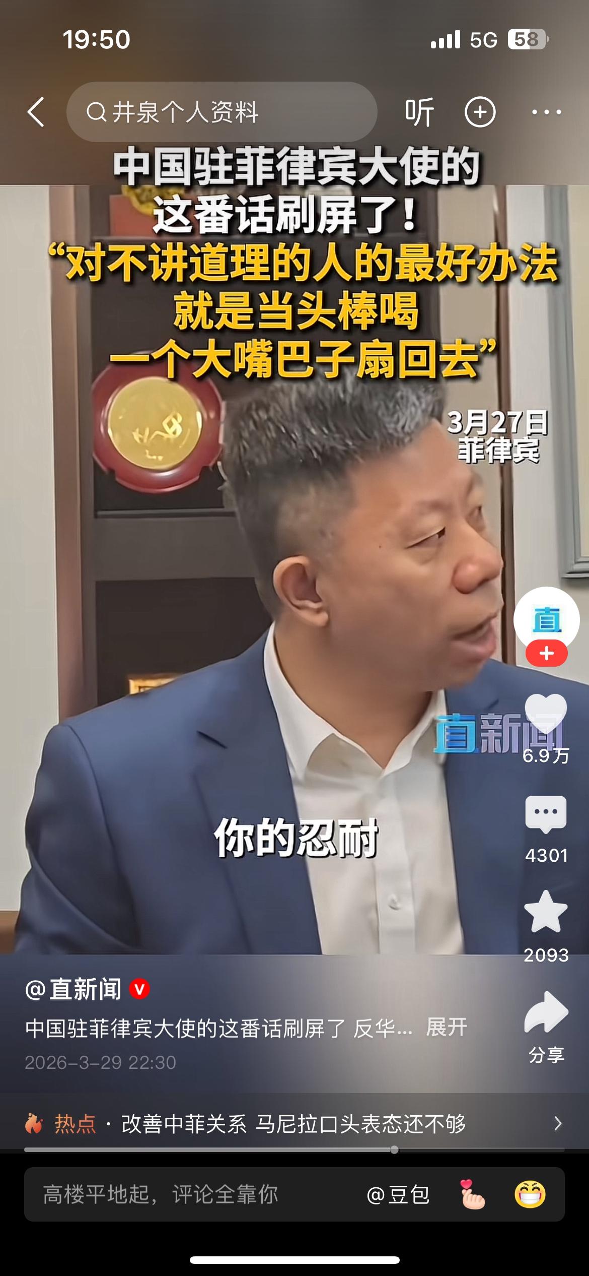 “对于这帮人最好的办法就是当头棒喝,一个大嘴巴子扇回去”,中国驻菲律宾大使井泉这番话说到了国人的心坎里,说的让人十分提气。 我们发展强大的国防是为了免受外部侵略,但是对那些侵略成性,不讲道理,蹬鼻子上脸的人,只有当头棒喝,大嘴巴子扇回去!