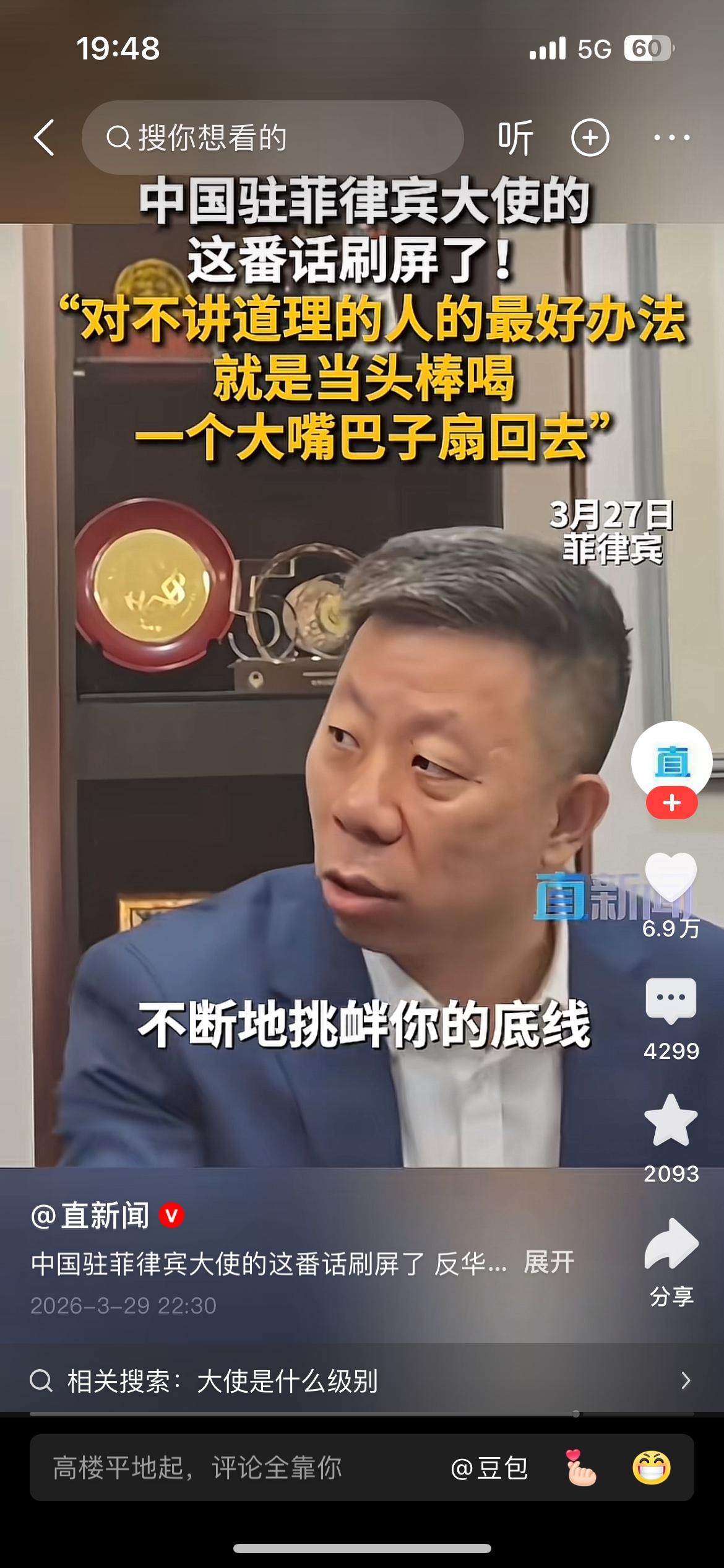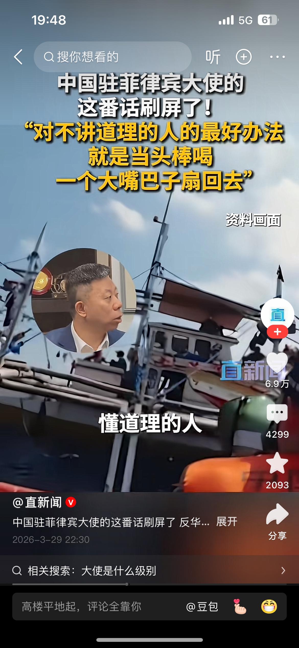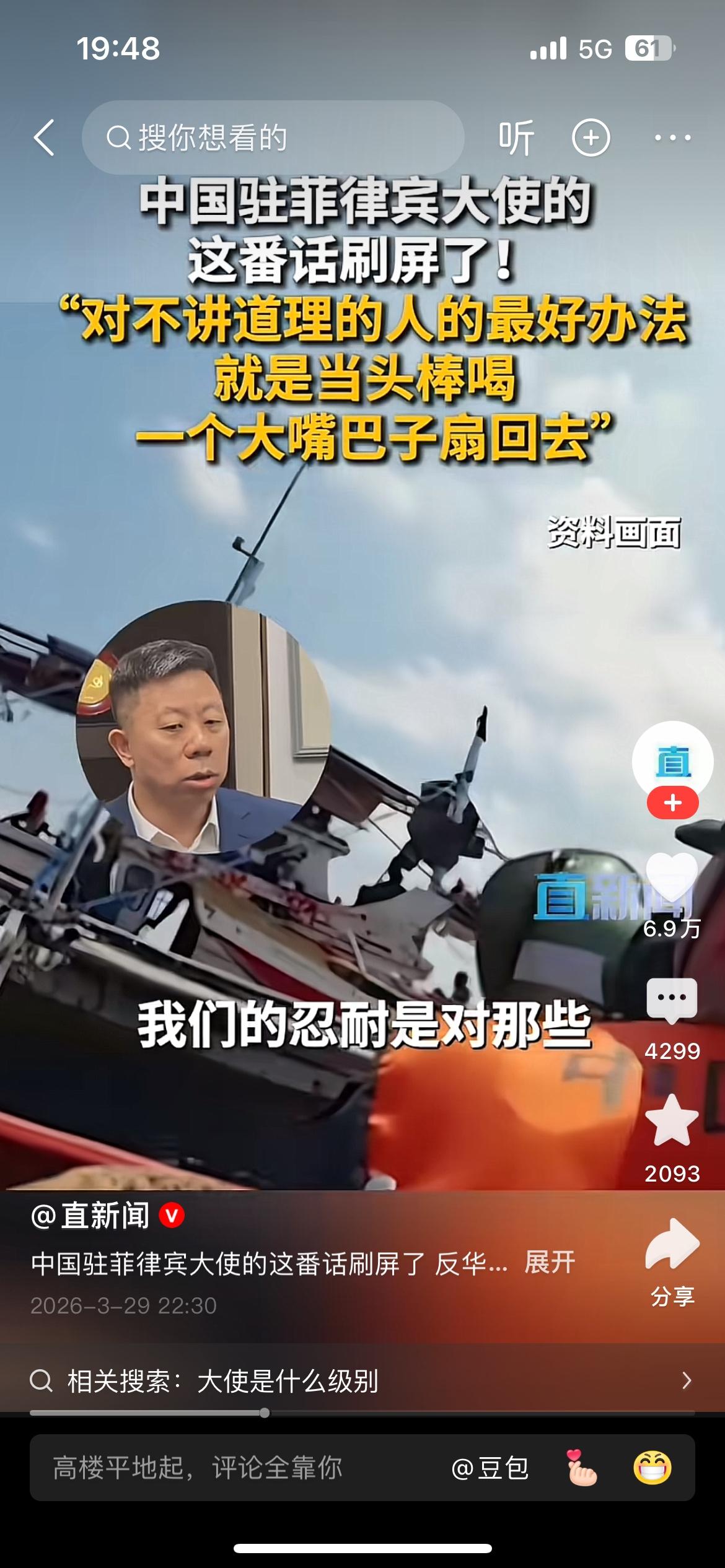 “对于这帮人最好的办法就是当头棒喝,一个大嘴巴子扇回去”,中国驻菲律宾大使井泉这番话说到了国人的心坎里,说的让人十分提气。 我们发展强大的国防是为了免受外部侵略,但是对那些侵略成性,不讲道理,蹬鼻子上脸的人,只有当头棒喝,大嘴巴子扇回去!