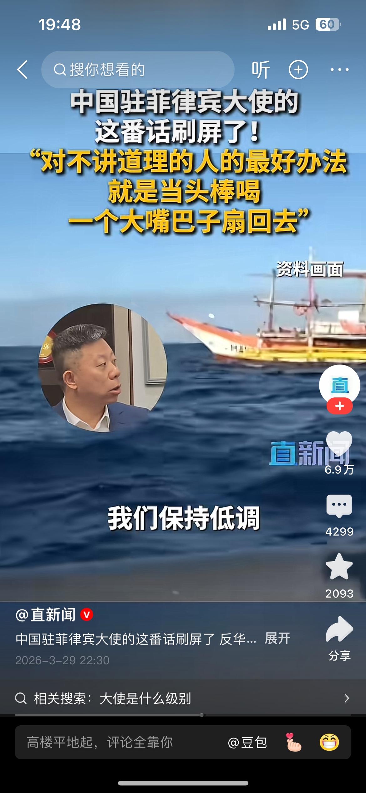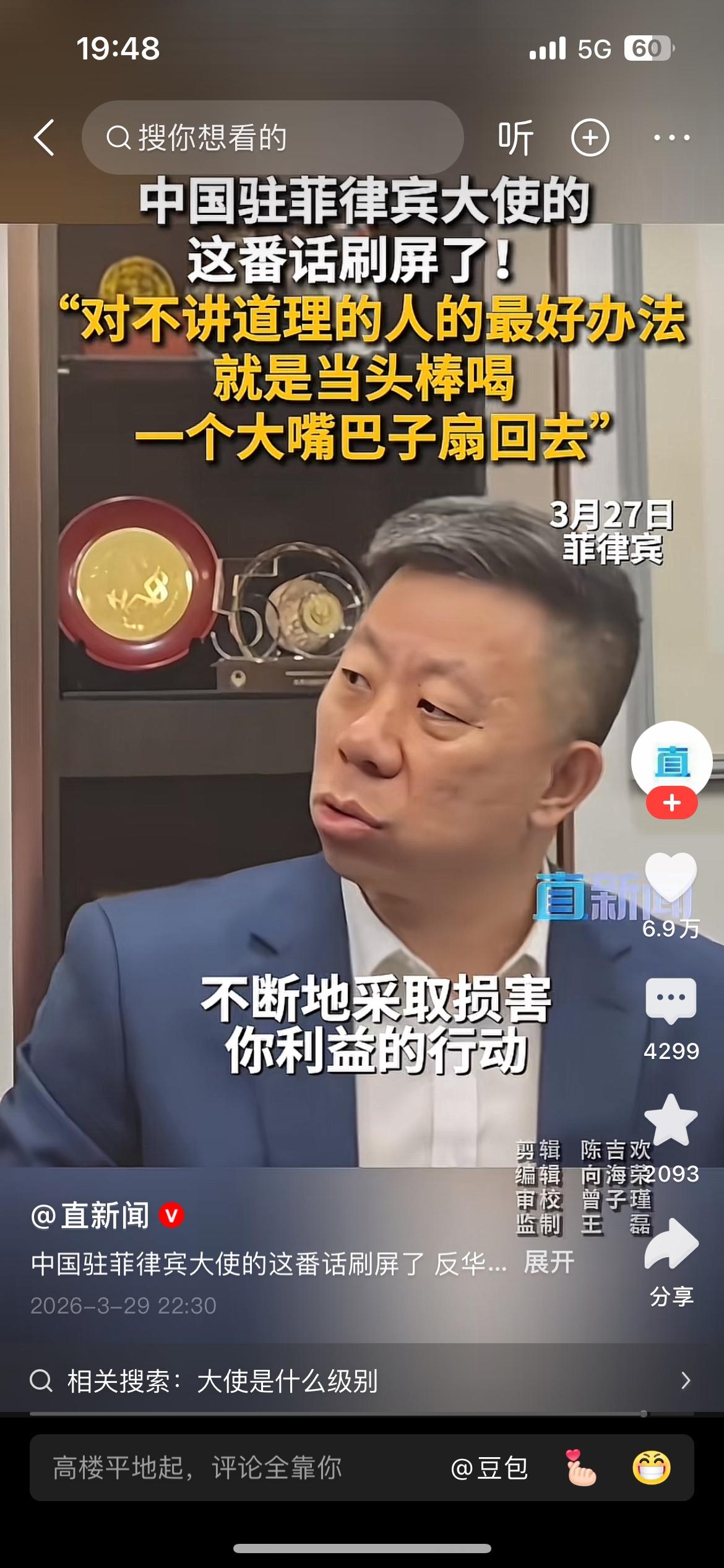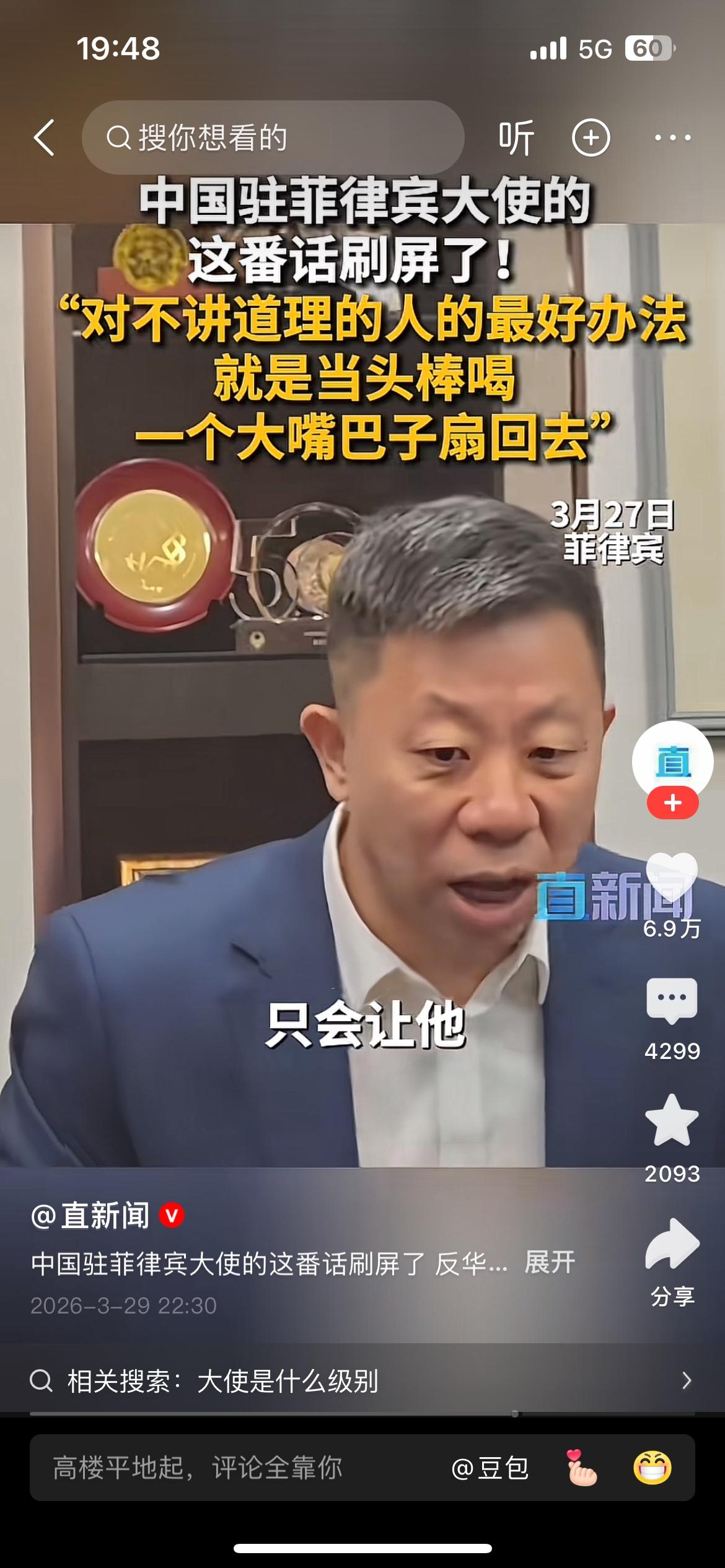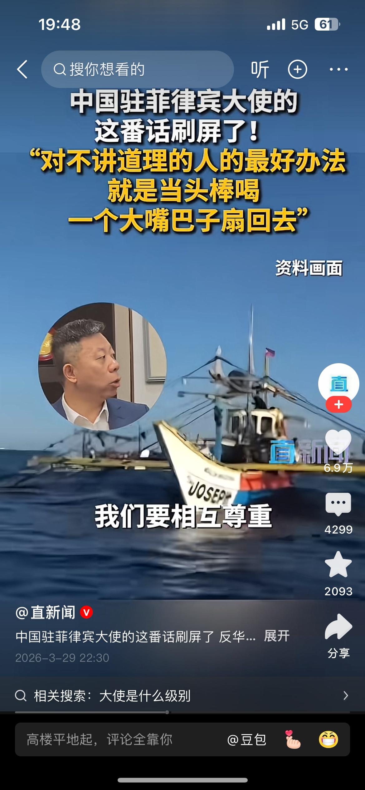 “对于这帮人最好的办法就是当头棒喝,一个大嘴巴子扇回去”,中国驻菲律宾大使井泉这番话说到了国人的心坎里,说的让人十分提气。 我们发展强大的国防是为了免受外部侵略,但是对那些侵略成性,不讲道理,蹬鼻子上脸的人,只有当头棒喝,大嘴巴子扇回去!