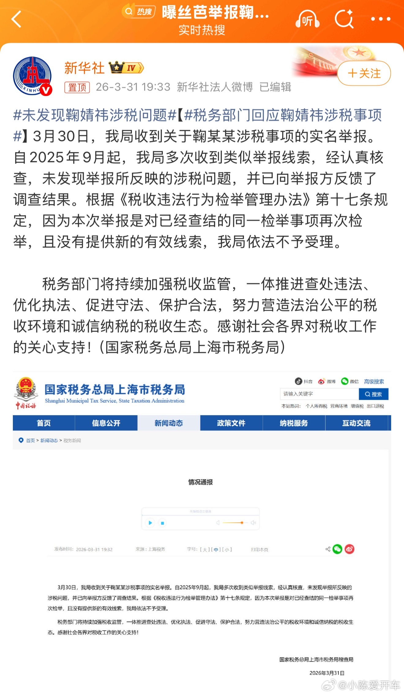 未发现鞠婧祎涉税问题我发现了一个问题,为什么总是喜欢挑女明星找事,男明星就少呢?还在🍊没有偷税漏税,不然就看不到这么一个舞台表演力那么好的鞠婧祎了!鞠婧祎
