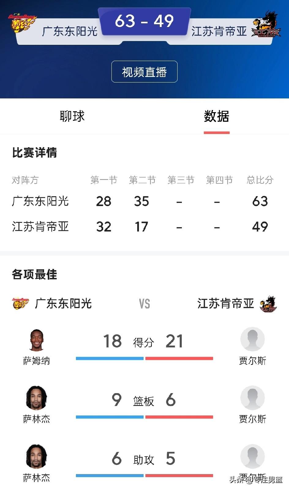 徐杰和胡明轩的状态都回来了! 徐杰、胡明轩各命中两记三分球,广东队外线一开就好打好多了,半场已经拿了63分了。 广东队半场领先江苏14分(63-49),第二节单节赢了江苏人18分! 王少杰上场7分钟领了3次犯规,没有焦泊乔,内线更弱了。 广东男篮vs江苏男篮
