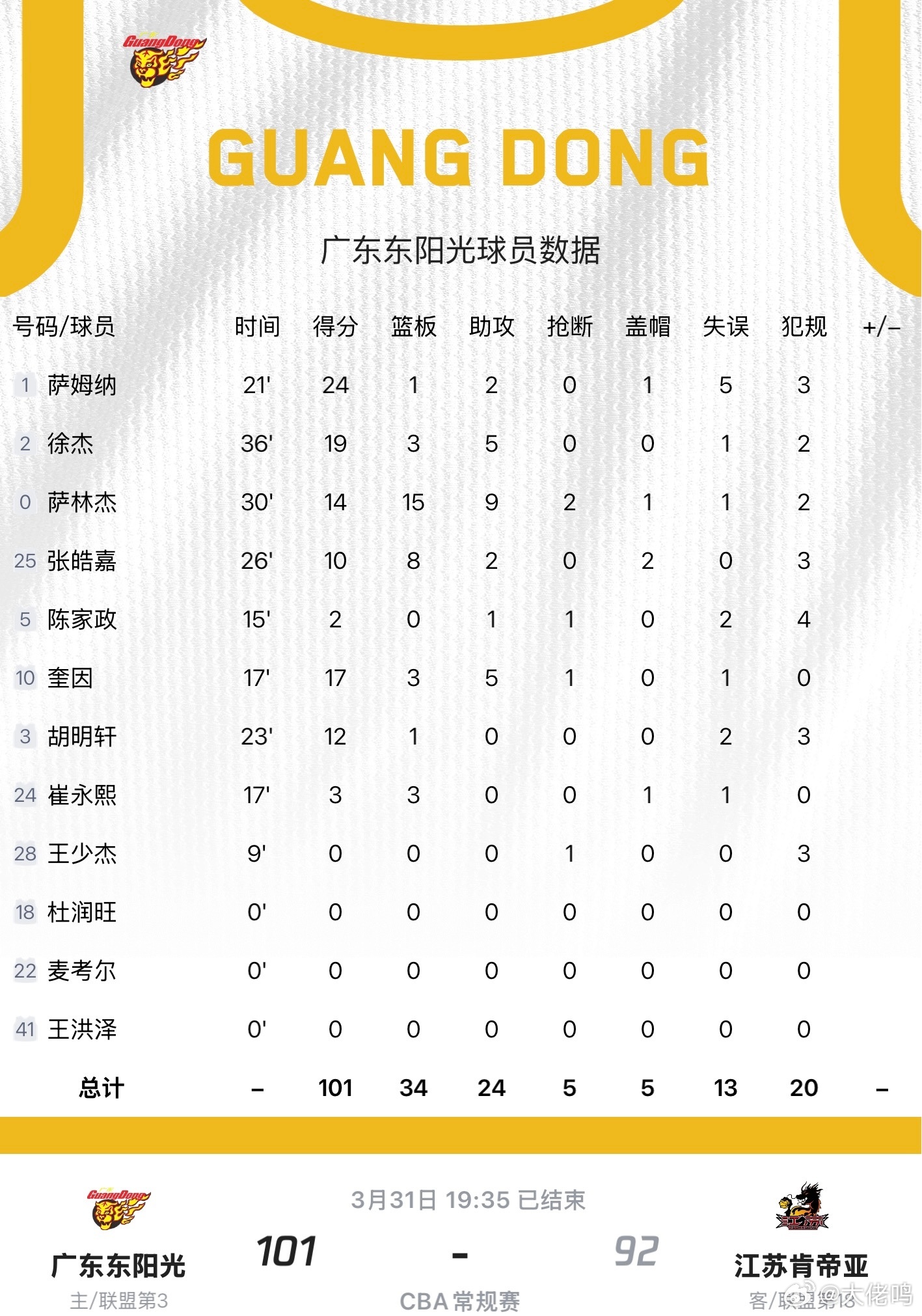 广东男篮vs江苏男篮6人得分上双,多点开花,这是广东队固有的赢球模式,这场依然是萨姆纳➕徐杰发挥最抢眼,萨林杰差点三双亦是状态复苏,因此这个结果并不奇怪……主场打江苏,对手不是软柿子,很难从头到尾一直领先,哪怕这样的数据,也有互不相让的时刻,这就是今年CBA的格局和现状!鸣聊体育