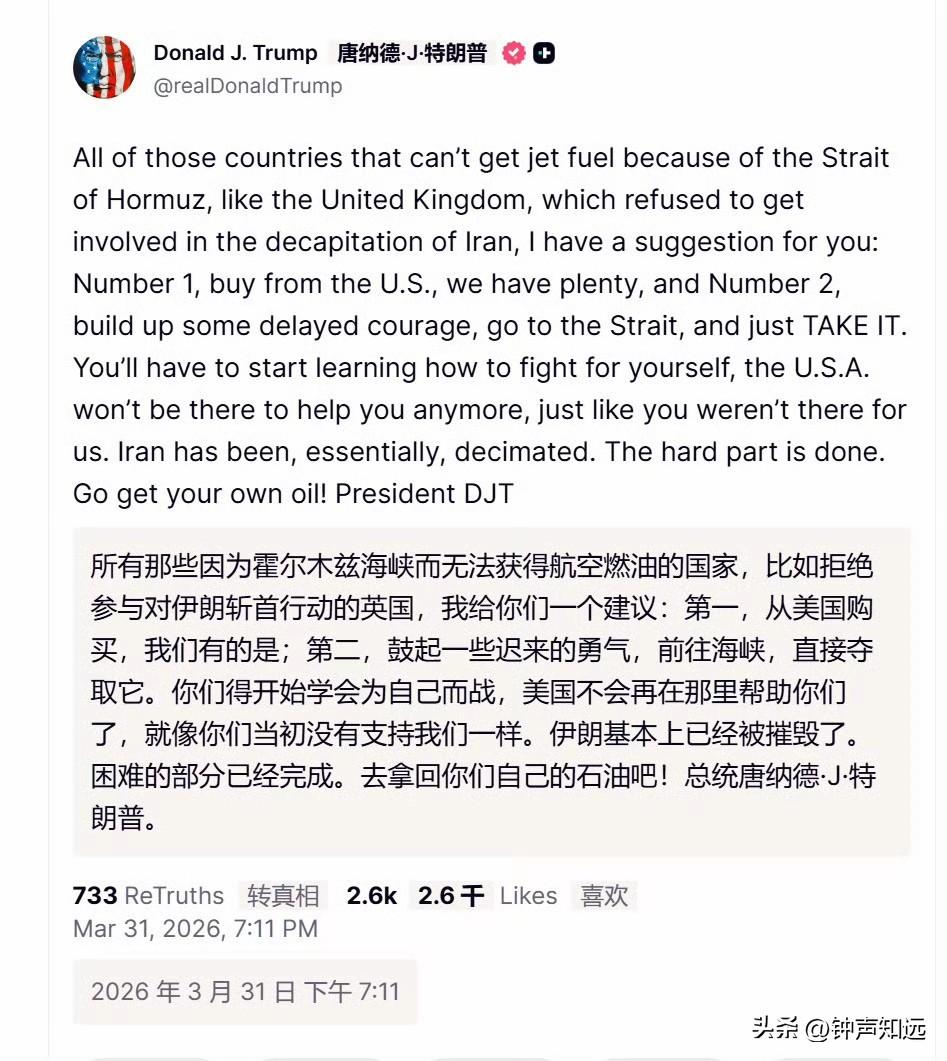 特朗普:去拿回你们的石油吧,要不就来美国买!“忽悠”盟友也不带这么玩的。 3月31号,特朗普发文称“所有那些因为霍尔木兹海峡而无法获得航空燃油的国家,比如拒绝参与对伊朗斩首行动的英国,我给你们一个建议:第一,从美国购买,我们有的是;第二,鼓起一些迟来的勇气,前往海峡,直接夺取它。你们得开始学会为自己而战,美国不会再在那里帮助你们了,就像你们当初没有支持我们一样。伊朗基本上已经被摧毁了。困难的部分已经完成。去拿回你们自己的石油吧!” 特朗普说伊朗被彻底摧毁了,要是真摧毁了那美国还担心什么,还会谈判吗?东方有位哲人说过“美国但凡讲一点道理,那一定是因为迫不得已”。盟友不来参与护航,特朗普就说“放心来”,这边都搞定了,这是忽悠谁呢? 特朗普对盟友没有对他“一呼百应”参与护航耿耿于怀,给英国记上一笔。不过他这条推文发了,伊朗会不会就给英国放行了[大笑][大笑] 这边法国也不允许飞往以色列的军机飞越领空,特朗普又记在小本本上了:“小样我记住你了”。 意大利也不让美军使用基地了,特朗普小本本又得记上一笔了。 特朗普这“小本本”快记满不够用了吧!
