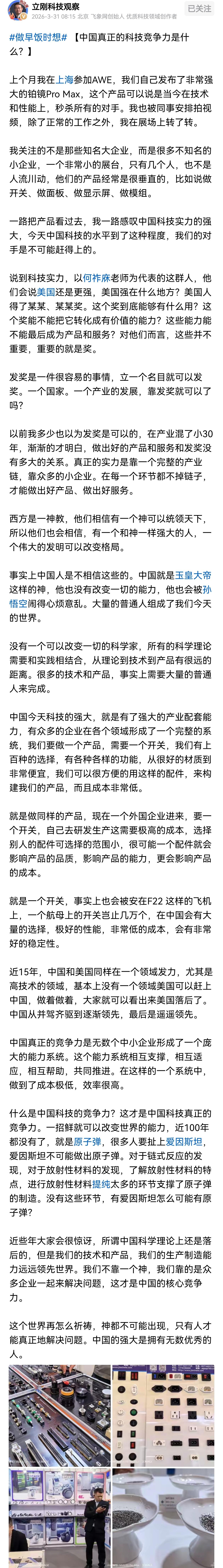 中国科技真正的竞争力是什么?项立刚认为是无数个中小企业形成了一个庞大的能力系统。 今天看了项立刚的一篇分析中国科技的文章,里面探讨了一个热门话题—中国科技真正的竞争力是什么?项立刚认为,它不是哪个权威的科学家,也不是什么科技理论,而是这么多年,无数个中小企业形成的庞大的能力系统,这些企业有做研发,有做生产,有做运输,有做分销,它们相互支撑,相互适应,相互帮助,共同推进。在这样的一个系统中,做到了成本极低,效率很高。 而反观其他国家,并没有如此完整的能力系统。它们不仅产业链残缺,要么没有研发,要么没有制造,要么就没有市场。甚至许多欧美国家近些年保守势力抬头,它们不是想着提高自己的科技产业能力,而是建起贸易壁垒,阻挡国外产品进入国内,这非但不会带来制造业的崛起和科技发展,反而会加剧本国产业对政策的依赖性。