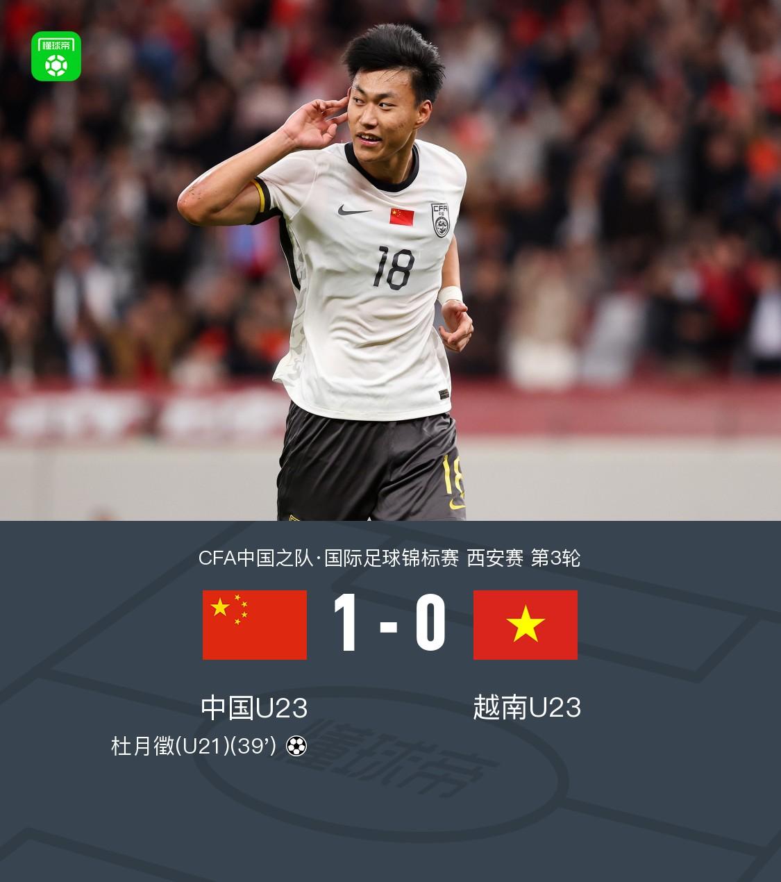 恭喜恭喜 !U23国足1-0越南U23第2收官 杜月徵精彩凌空世界波制胜。 中国U23因净胜球劣势获西安青年足球锦标赛亚军,朝鲜U23夺冠。 中国小伙子们还是可以了,三场都没输。U23足球队