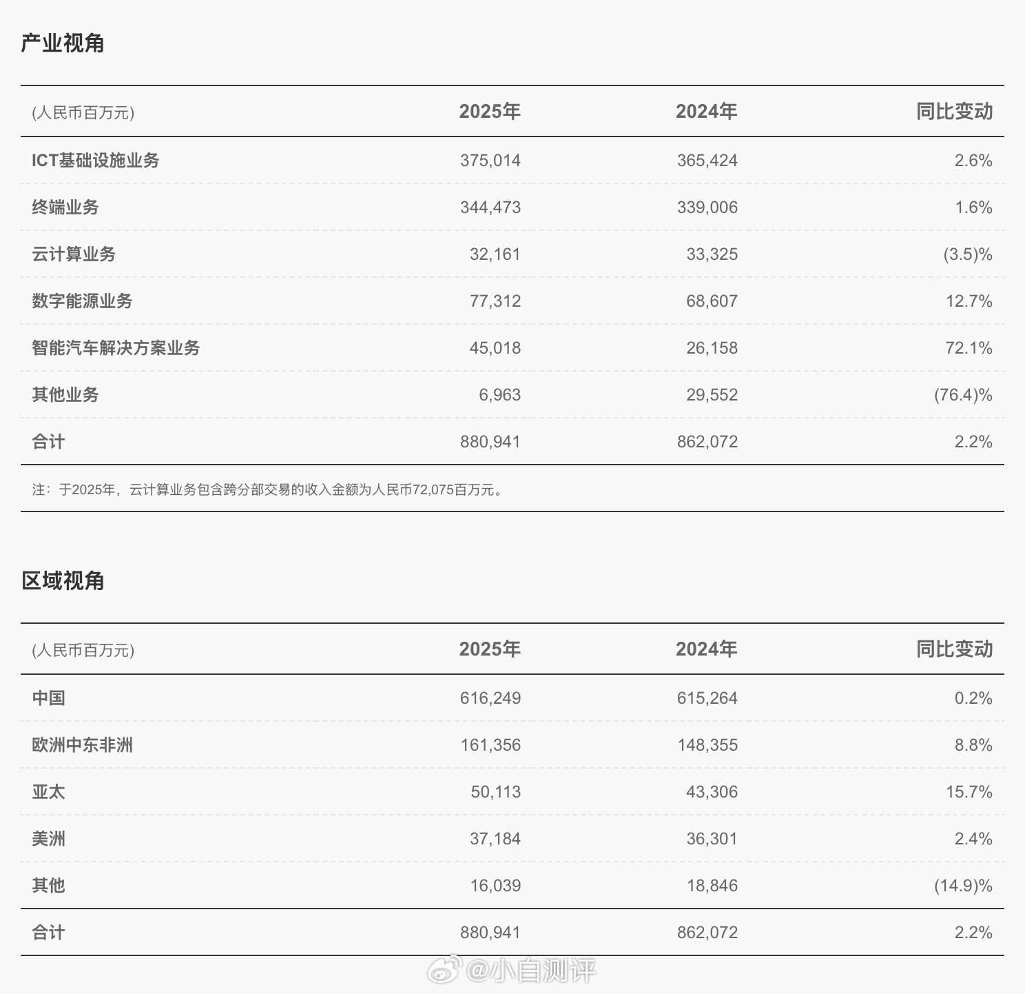 华为发布2025年度报告:2025年经营结果符合预期,全球销售收入8809.4亿元人民币,净利润680.36亿元。2025年研发投入达到1923亿元,约占全年收入的21.8%,近十年累计投入的研发费用超过13820亿元。图3是不同产业业务和区域具体情况。过去一年,你有买过华为的产品吗?