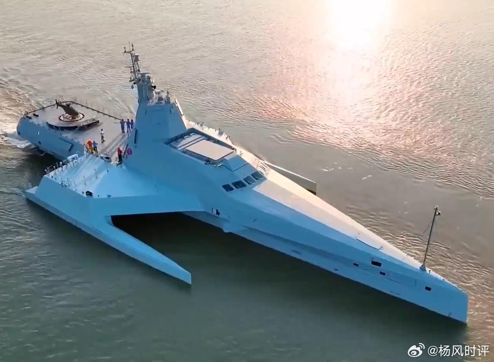 虎鲸的外观造型迥异,全然没有常规舰船的规整。它最核心的便是三体船构型,中间主船体支撑核心设备,两侧细长片体如同双翼,设计精巧。这种结构主要是为了贴合实战需求,细长船体大幅降低航行阻力,最大航速可达40节,机动性能较强。三体架构抗浪性出众,五级海况可从容作战,七级海况下仍可保证平台生存安全,远赴远海毫无压力。同时拓宽甲板面积,可搭载相控阵雷达、垂发装置及无人机起降平台,空间利用率发挥到极致。再看整体外观,全是利落的倾斜棱角,所有设备隐匿于船体之内。这是极致的隐身设计,能大幅削弱雷达信号,突防与生存能力直线提升。更关键的是,它不再设置常规驾驶舱与舷窗等人操核心设施,是一座智能海上作战平台,这种无人化设计,正是未来无人装备的核心方向。很多人疑惑,虎鲸2022年初次海试,如今四年还在海试,是不是技术卡壳了?其实不然。虎鲸不是普通巡逻艇,而是带垂发、配相控阵、能远洋作战的大型主战装备。无人装备最看重可靠性,远海失联、误判、故障都可能酿成大祸,宁可多花时间穷尽极端测试,也绝不带隐患入列,这是对实战的负责。