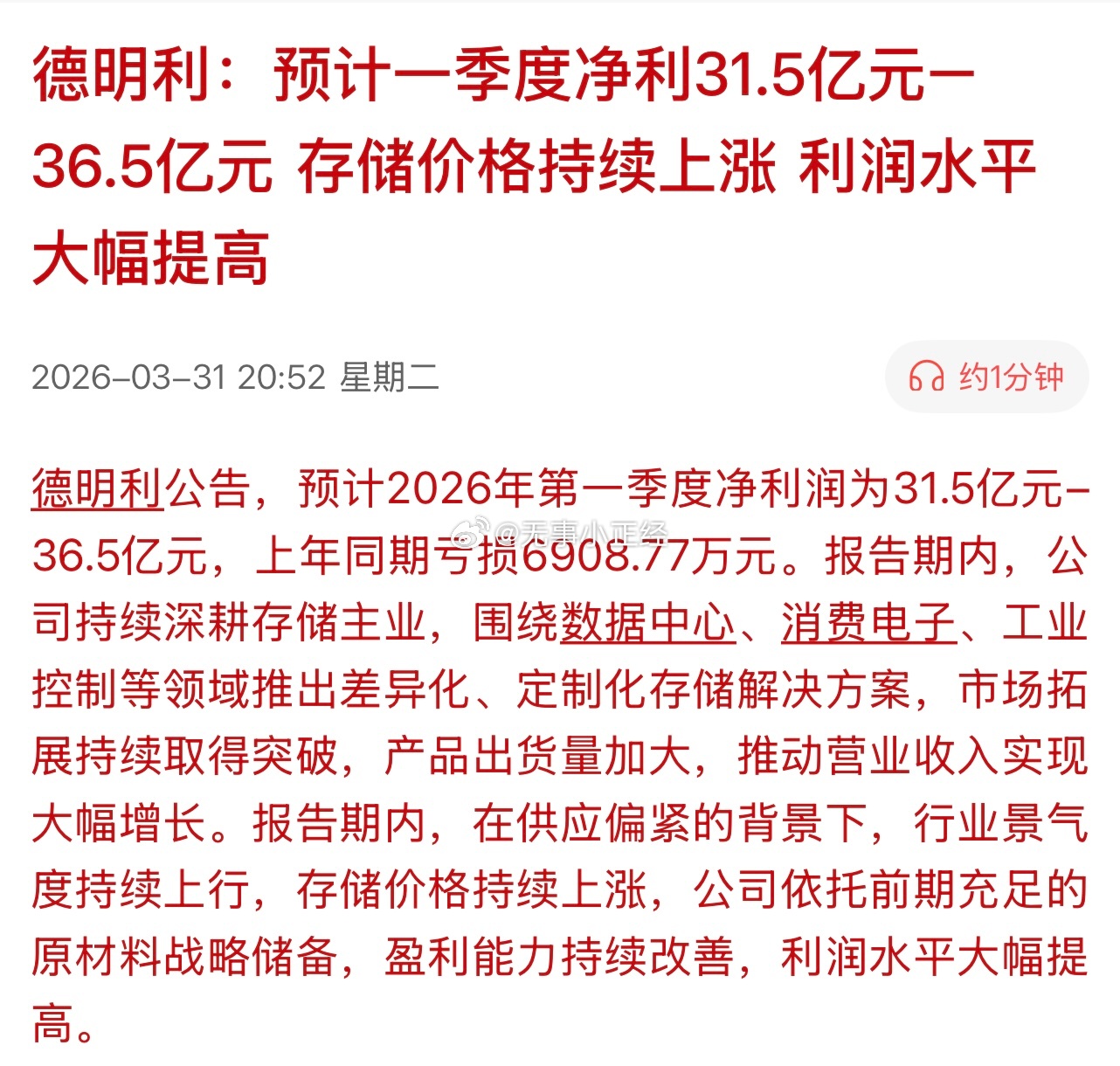 德明利:预计一季度净利31.5亿元一36.5亿元,存储价格持续上涨 利润水平大幅提高