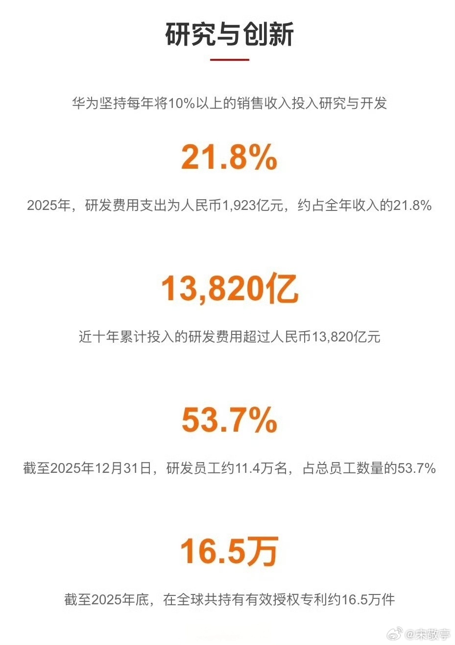 华为2025年净利润680亿华为2025年度报告,营收8809亿,净利润680亿!尤其2025研发投入达到1923亿元,近十年累计投入的研发费用超过13820亿元人民币。这高强度研发国内依然是无敌的存在! 华为2025年研发投入1923亿