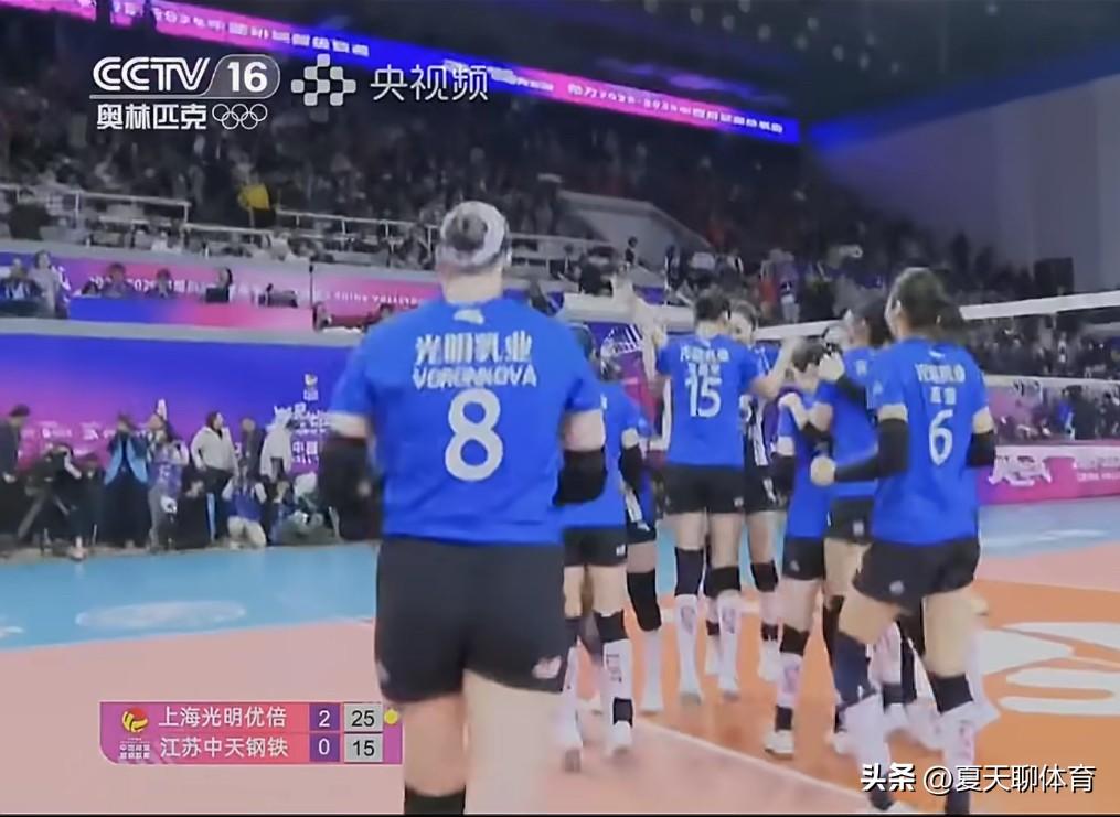 上海女排光发球就拿了13分啊,你让江苏女排怎么赢啊!范赖克和沃龙科娃两位外援都打出了身价,蔡斌今天也学会了换人,朱星辰和王唯漪换着来用,明晚上19:00的决战,仲慧、王唯漪等这批上海 女排老将的谢幕之战,仲慧就应该像今晚这场打,给自己职业生涯画上一个圆满的句号,拿金牌光荣退役,也让外援范赖克的眼泪不白流,也让沃龙科娃圆了中国联赛金牌梦!