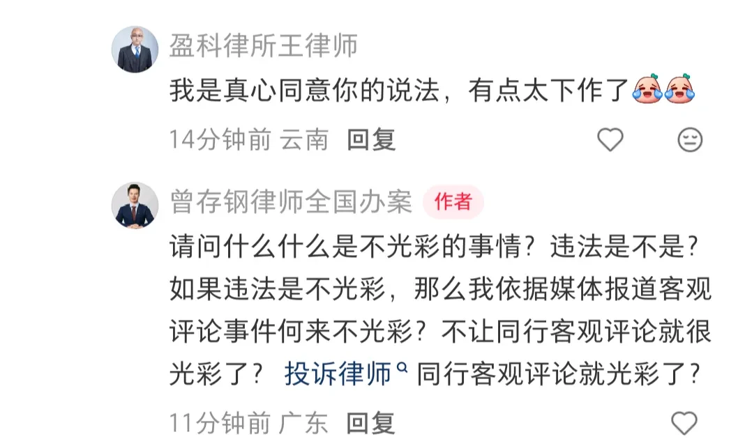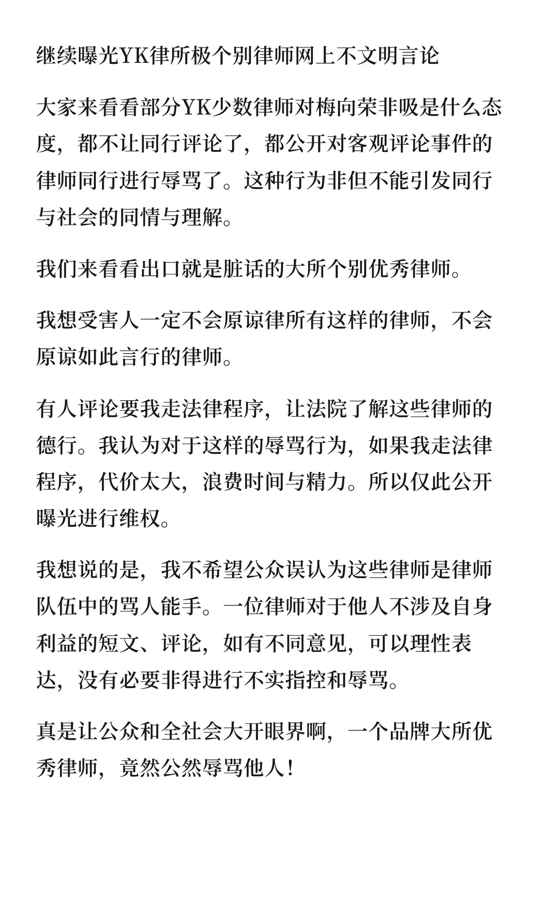 我想说的是,我不希望公众误认为这些律师是律师队伍中的骂人能手。一位律师对于他人不涉及自身利益的短文、评论,如有不同意见,可以理性表达,没有必要非得进行不实指控和辱骂。