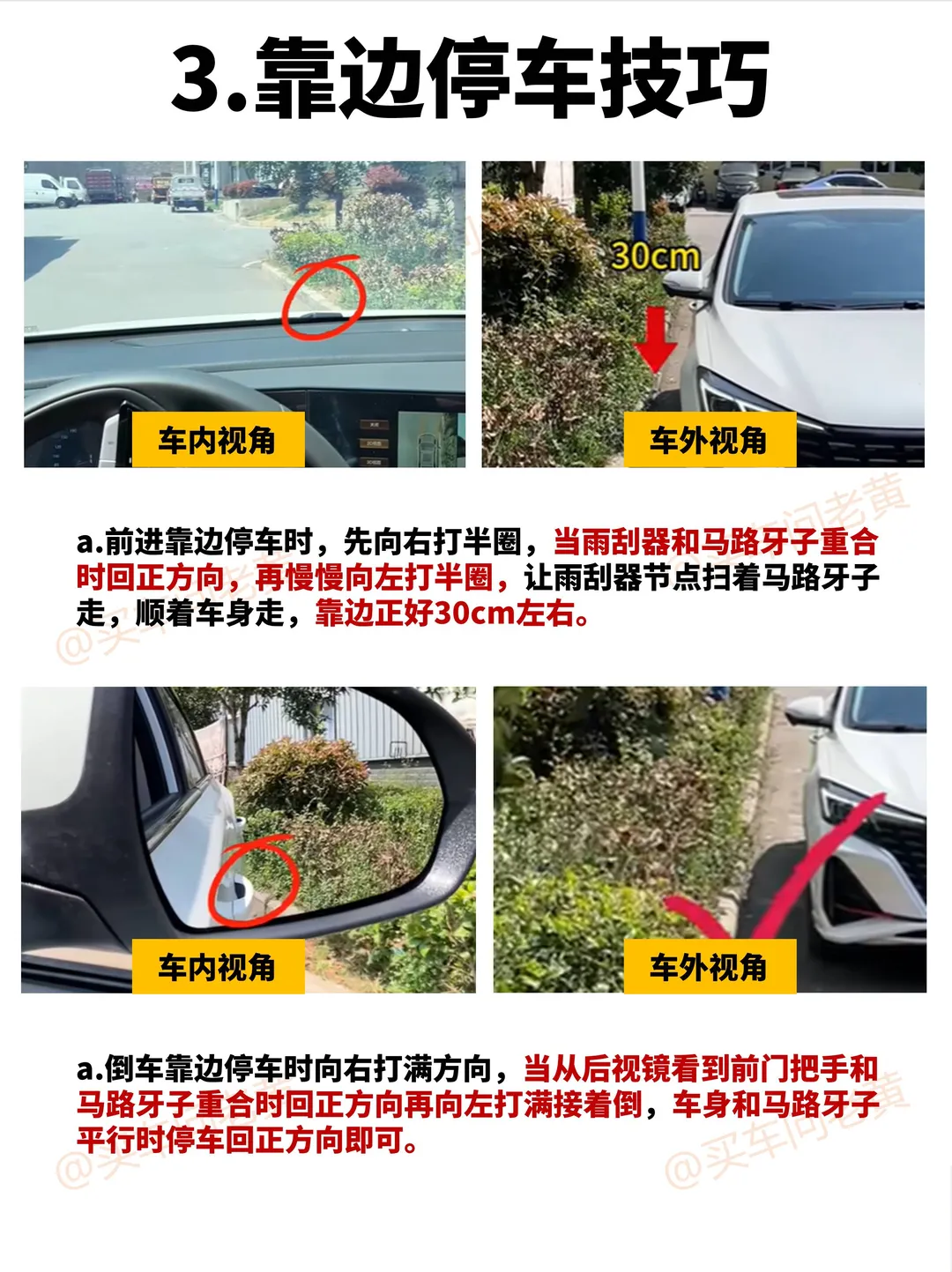 倒车贴边:先右打满方向,看后视镜,前门把手碰到马路牙子就回正,再左打满倒车,车身直了立马停,完美30cm!