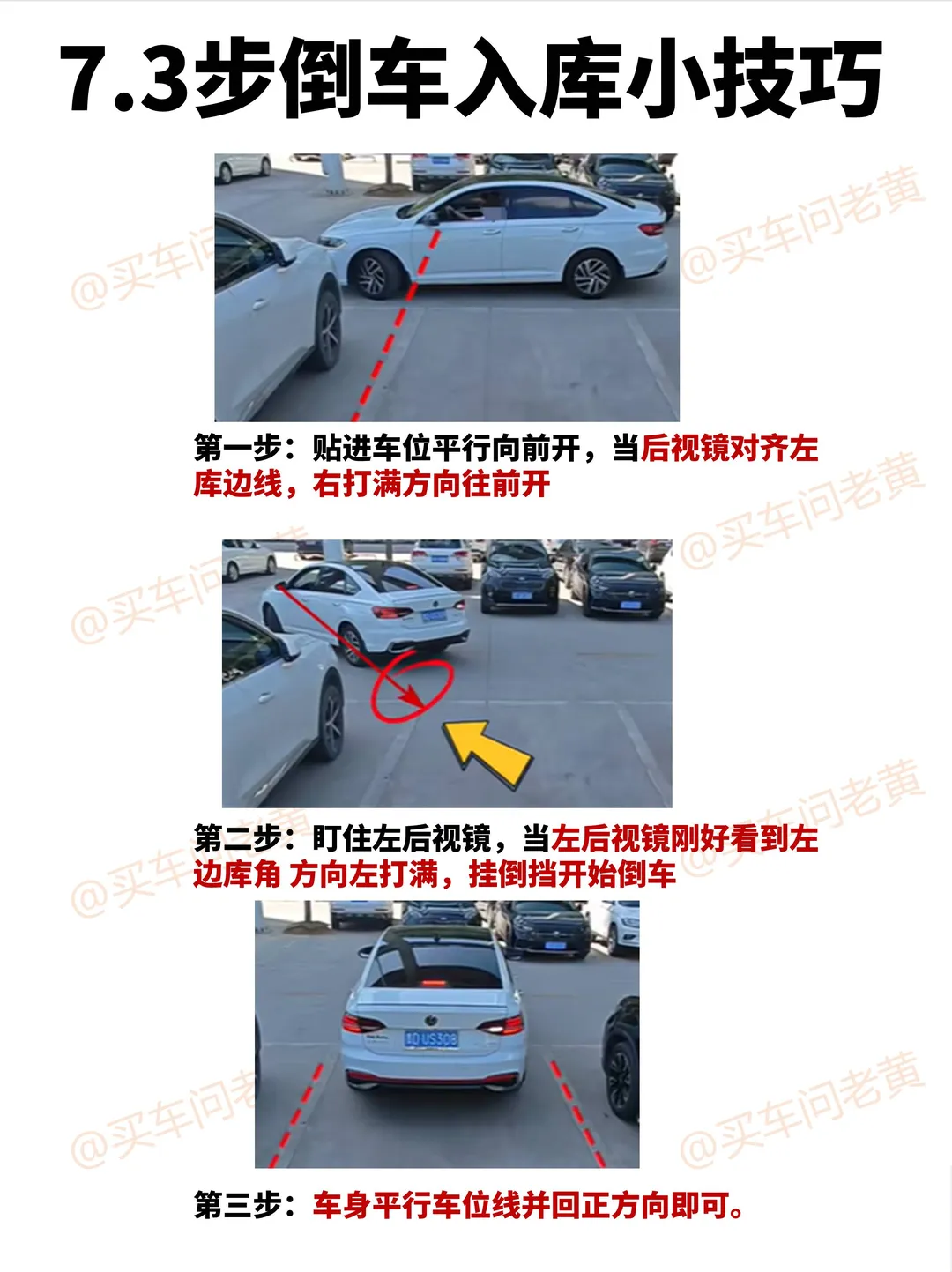 等右A柱挡住前车的尾灯,左打满继续倒,稳稳一把进库,不用来回调整!
