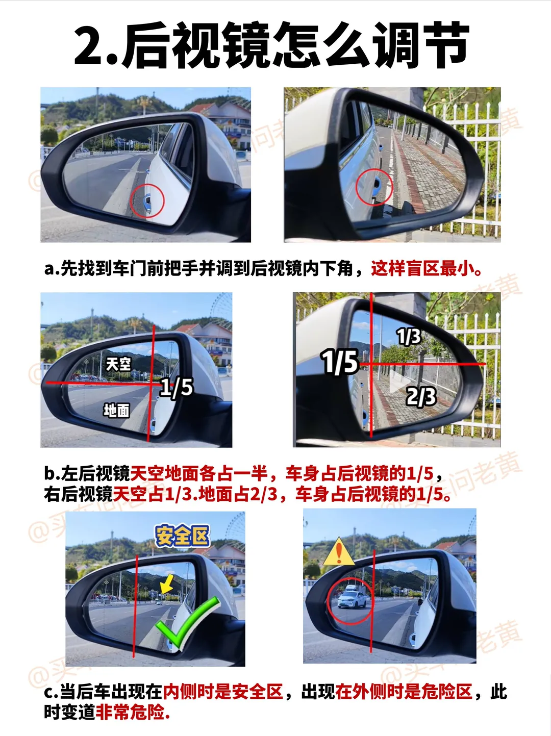 ❶ 盲区小调法:左镜天地各占一半,右镜天空占1/3、车身只留1/5;后车在镜子内侧,就能安全变道,在外侧就别变!