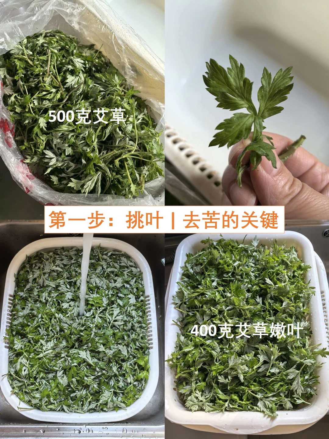 关键动作:只要顶端嫩叶和嫩芽! 老叶、粗梗、发黄的叶子全部去掉。这是保证艾草泥不苦、香气足的最关键一步,别偷懒。(我是从500克的艾草中取了400克的嫩叶。)摘完清洗干净。