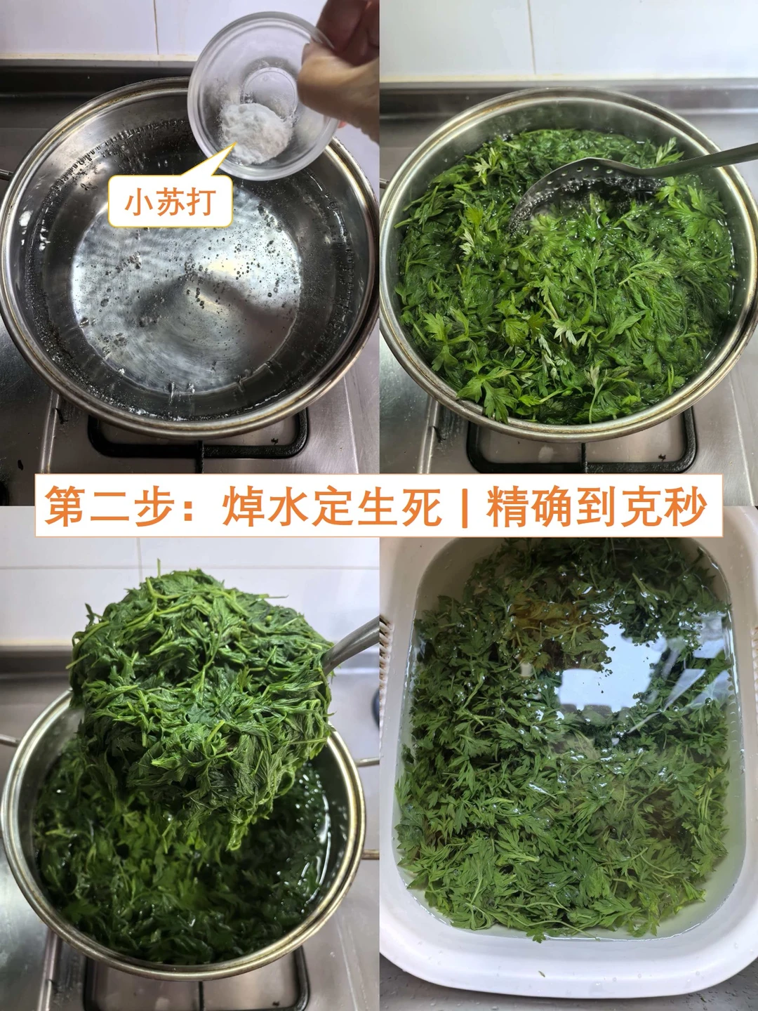 关键动作:水沸+3g小苏打,下400g嫩艾草,计时1分钟立刻捞出,投入冰水。