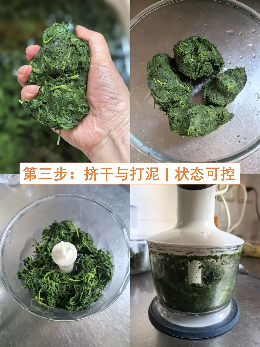 动作:捞出后彻底挤干水分,挤干的艾草泥大约350克上下,加入350ml清水,用料理机打成细腻泥,越碎越好。