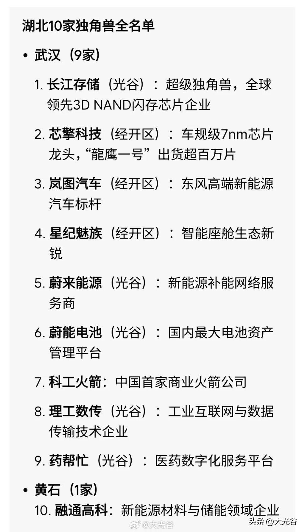 10家企业跻身中国独角兽!武汉9家、经开区3席领跑 3月29日,2026中关村论坛年会平行论坛——全球独角兽企业大会在北京举行,《中国独角兽企业年度报告(2026年)》正式发布 。中国独角兽企业达416家,创历史新高;湖北共10家企业上榜,其中9家总部在武汉,彰显湖北科创硬实力。 中国独角兽总估值1.6万亿美元,覆盖AI、集成电路、新能源等八大赛道 。长江存储跻身超级独角兽(估值超百亿美元),位列全国第4。武汉经开区芯擎、岚图、星纪魅族3家入选,“车谷”智能网联与芯片集群优势凸显。光谷独占5席,集成电路、新能源、商业航天多点开花。