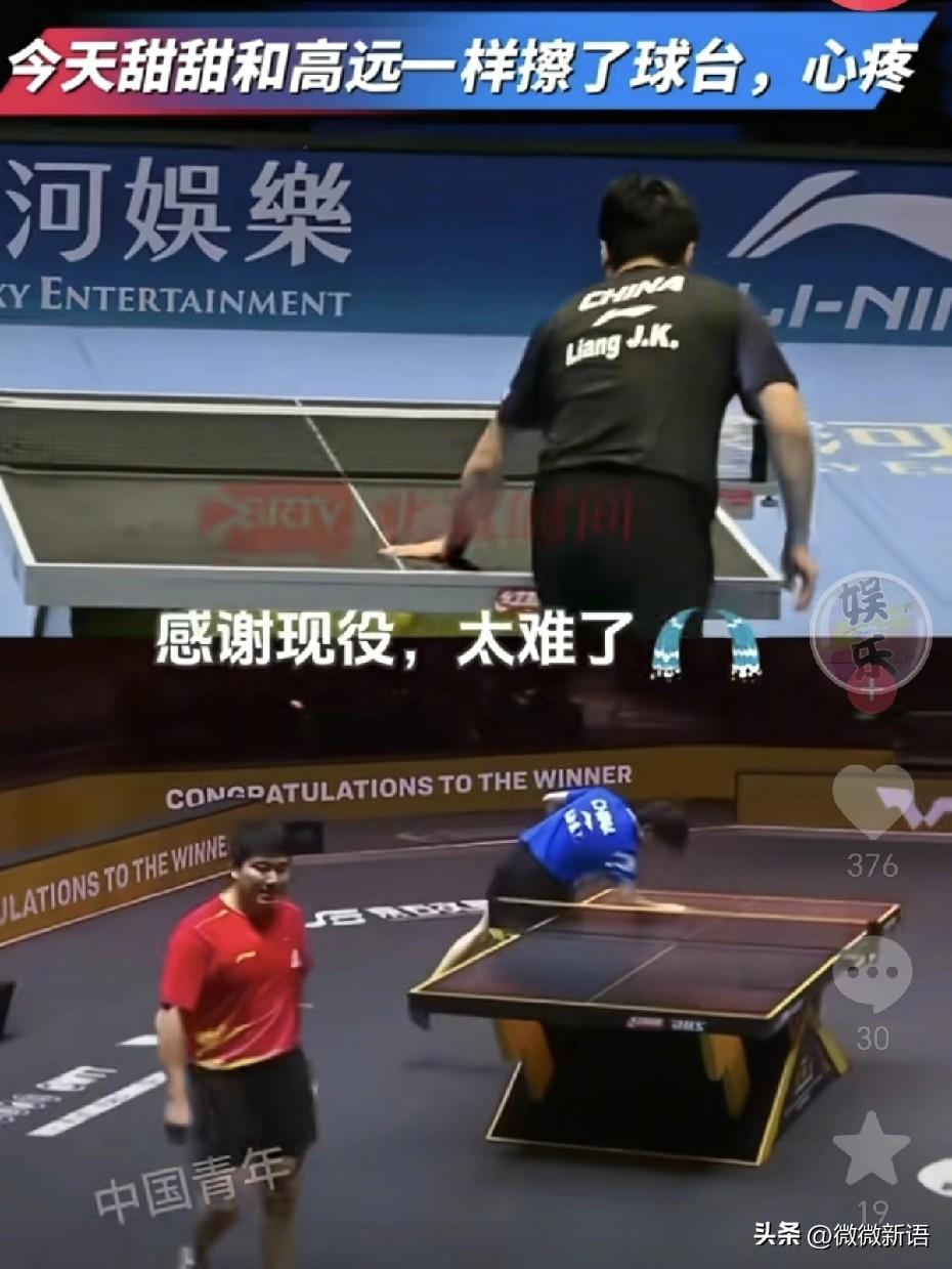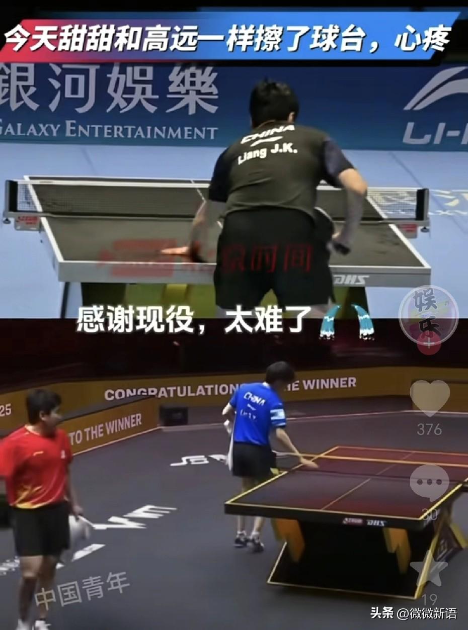 今天赛后梁靖崑也在那擦了球台,看到这一幕有点心疼老将了。去年的中国大满贯赛,梁靖崑看着高远在那擦球台,看到他的眼里有心疼,那是高远在和国际比赛的球台告别,从那以后林高远也就没再参加国际比赛了,现在他应该也离开国家队了,一直在省队训练,今天看到梁靖崑也在那擦球台,梁靖崑的比赛也是看一场少一场了。 这段时间梁靖崑一直有伤病在身,这次世界杯如果打不出来,世乒赛应该就真的没有机会了,今天的比赛他也想赢,可能还是身体的原因,限制了他的发挥。王皓虽然也在鼓励梁靖崑,但是因为伤病的困扰,再加上今天对手发挥的好,看到梁靖崑确实打的没有以前有信心。 看到这个画面后,有网友说:“不可以,我们球迷接受不了,甜甜不参加国际赛,太难过了,明天支棱起来就好了。”运动员真的不容易,拼到这个年纪就一身伤病,林诗栋因为肩伤也是连续退了两站的比赛,希望每一位运动员都健康完赛!
