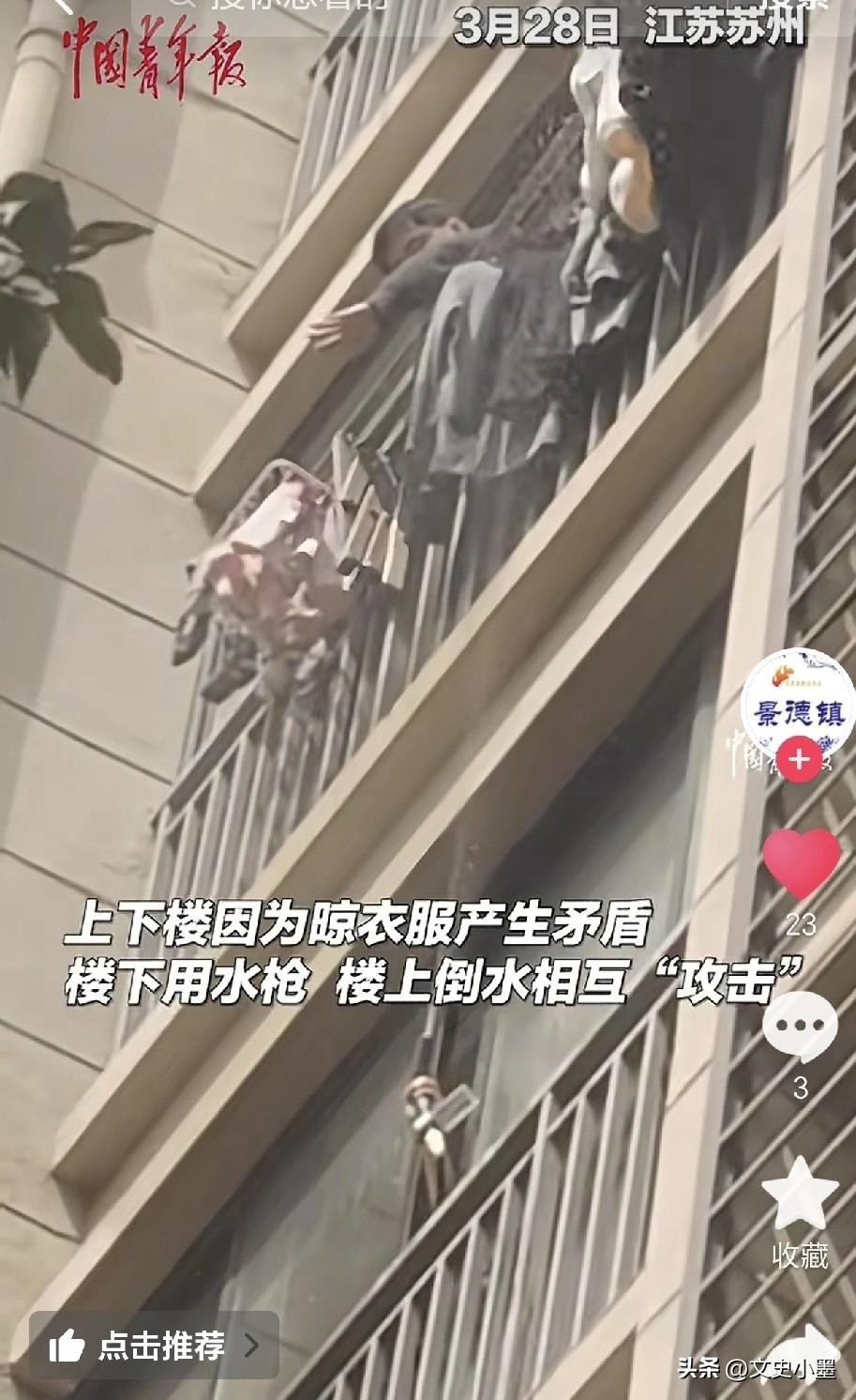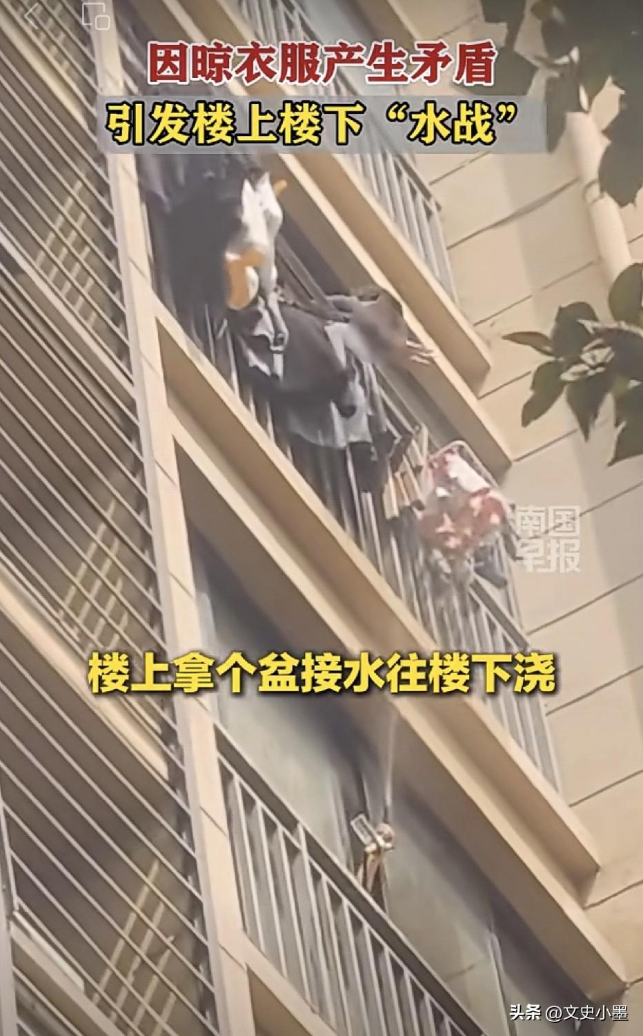 江苏苏州,某小区内一位业主洗完衣服后,觉得外面干得快,便把衣服挂到了阳台外面晾晒,结果他的这一举动引起了楼下邻居的不满,两家争吵了起来,打起了“水仗”,楼上的拿盆往楼下邻居家洒水,楼下邻居不甘示弱拿出水枪,往楼上喷水! 一般来说,在阳台外晾晒衣服不会引起邻里纠纷,除非楼上住户没把衣服甩干便挂到外面了,湿衣服要是滴水,再加高层有风吹过,很可能会把滴落的水珠吹到楼下邻居家里! 要是有水珠滴到家里,这事搁谁身上都会生气!不过楼下的住户在打“水仗”方面,地形上不占优势。除非用高压水枪,不然不好往上喷水!楼上邻居居高临下,随便泼!另外,要是楼上邻居记仇的话,晚上在家里制造点声音,就会吵的楼下苦不堪言!当然,住在楼下的邻居也有办法干扰楼上正常生活!但这些都是下下策! 所以,这件事还是要妥善解决,毕竟是楼上下楼邻居,低头不见抬头见的,双方互相让一步,大事化小,小事化了!