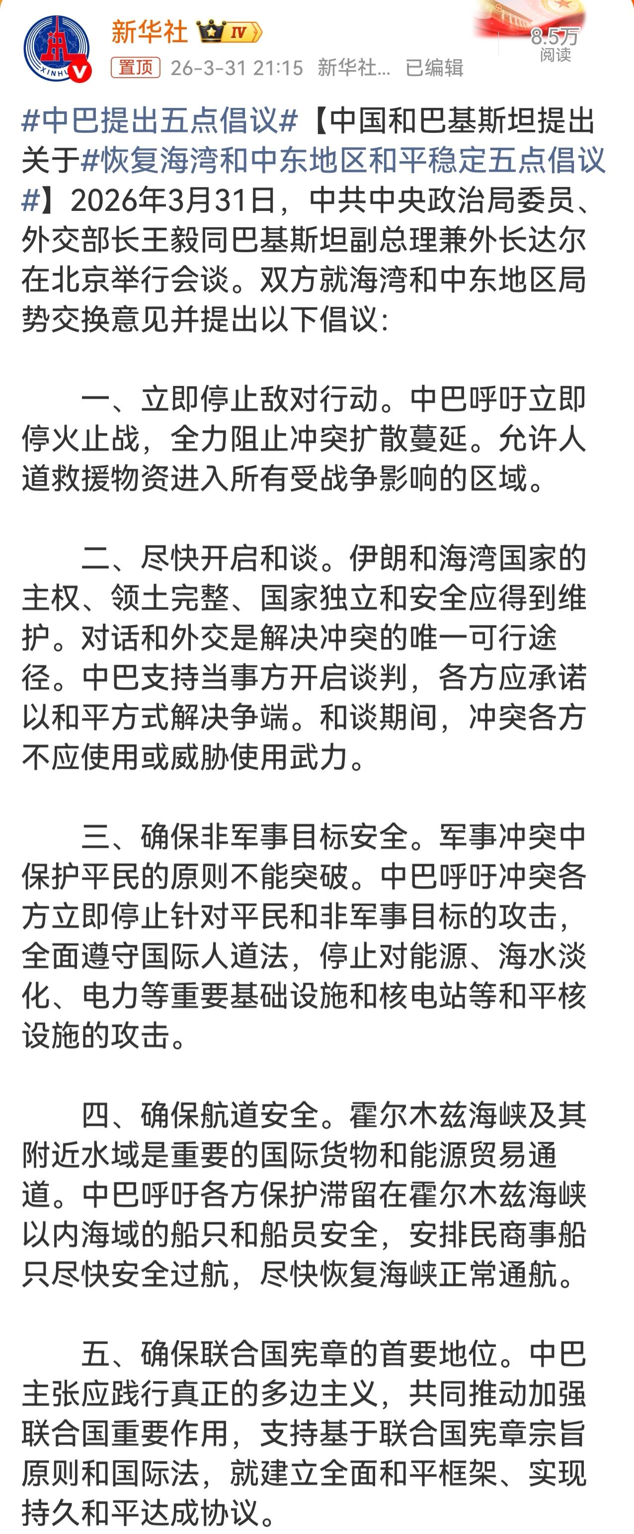 中国和巴基斯坦联合提出五点倡议。根据国际政治里的潜规则,一般来说谁提出方案,谁就要准备斡旋,这次中巴联合提出倡议,应该是要一起共同调停美以伊冲突。这在外交上叫:共同斡旋、共同担保、共同推动。中巴如果能调停,确实再合适不过了。中巴两国都跟海湾国家关系稳定,在美国那边分量也够足。川普那边今天在降温,也许在发倡议之前已经坐下来谈过了,说不定真能调解成功。