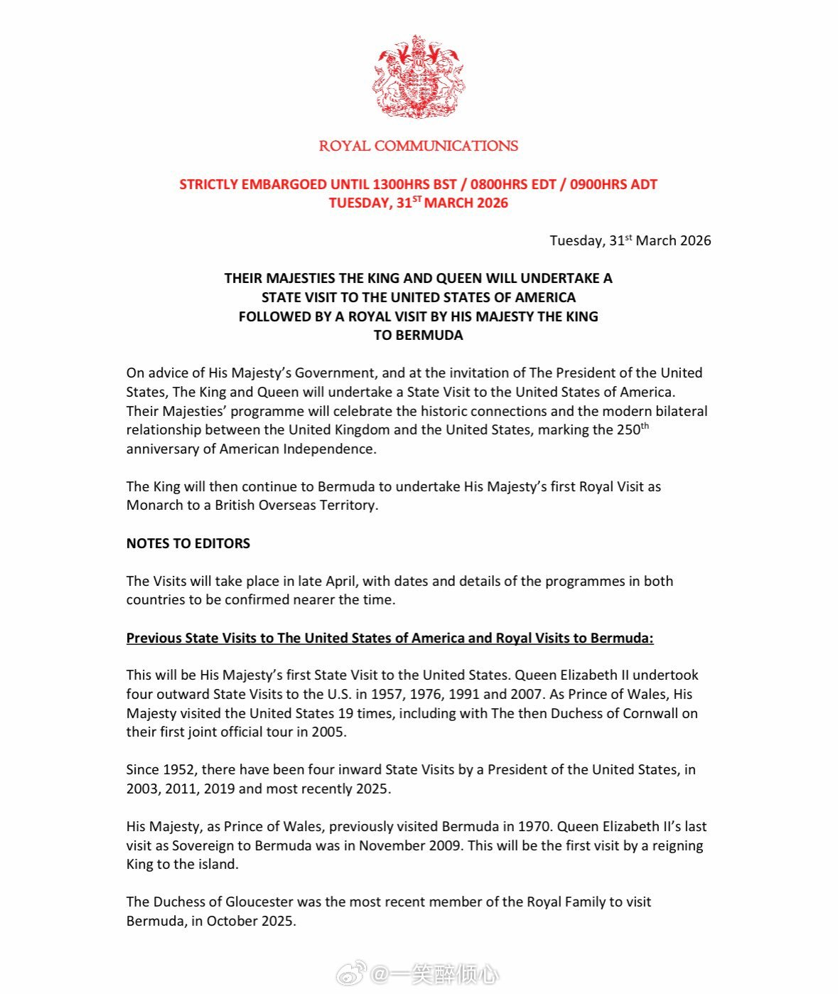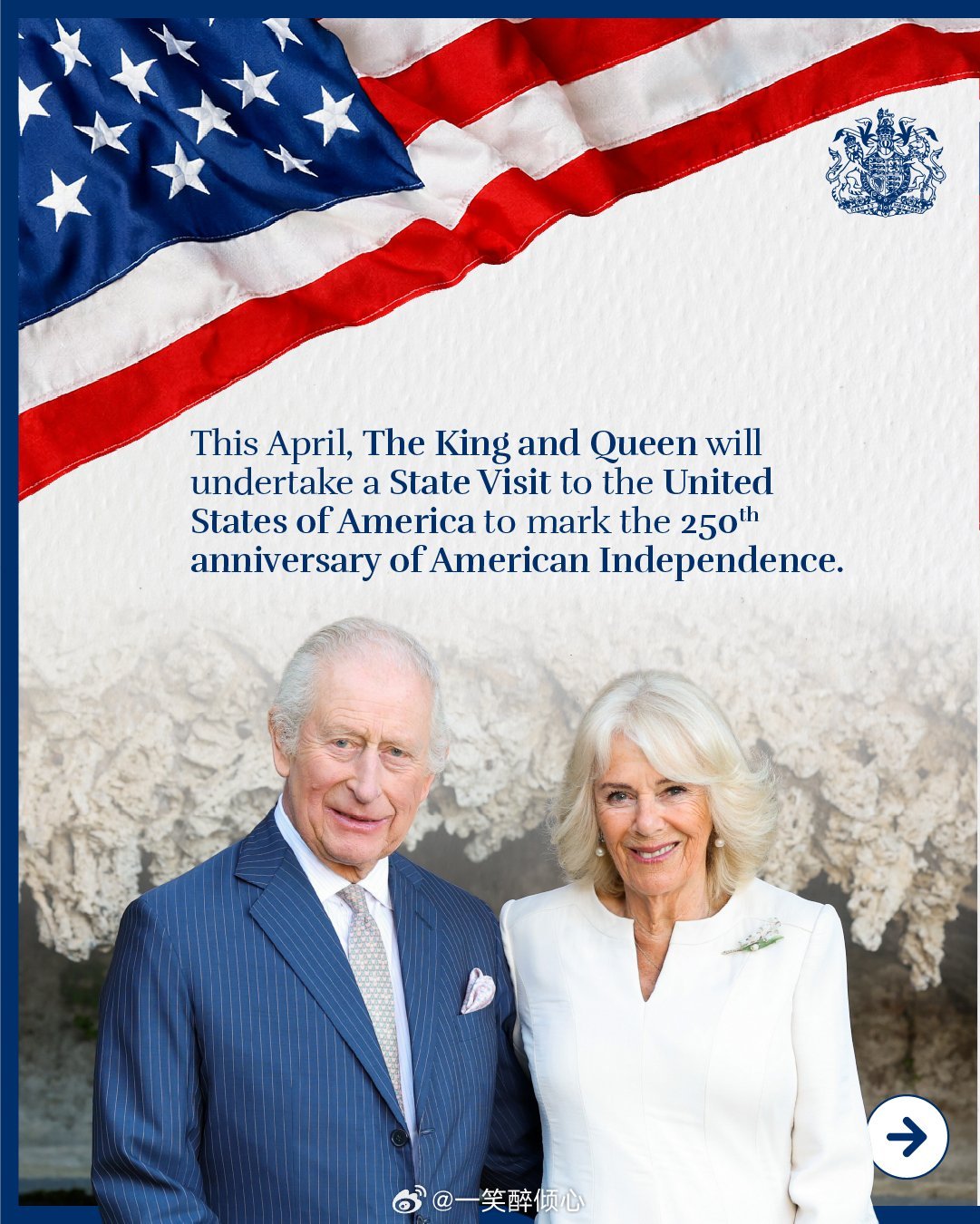 好了,经过橙毛喋喋不休地扯老查千百次之后,白金汉宫刚刚才宣布查尔斯三世和卡米拉王后将于四月底访问美国🇺🇸。随后,查尔斯三世将会单独访问百慕大🇧🇲。