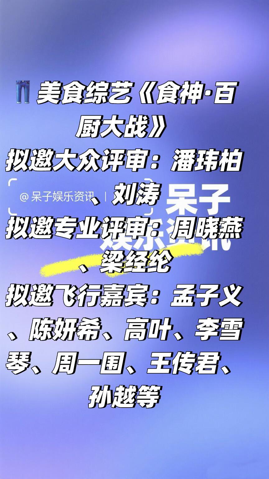 👖美食综艺《食神·百厨大战》阵容拟邀大众评审:潘玮柏、刘涛拟邀专业评审:周晓燕、梁经纶拟邀飞行嘉宾:孟子义、陈妍希、高叶、李雪琴、周一围、王传君、孙越等