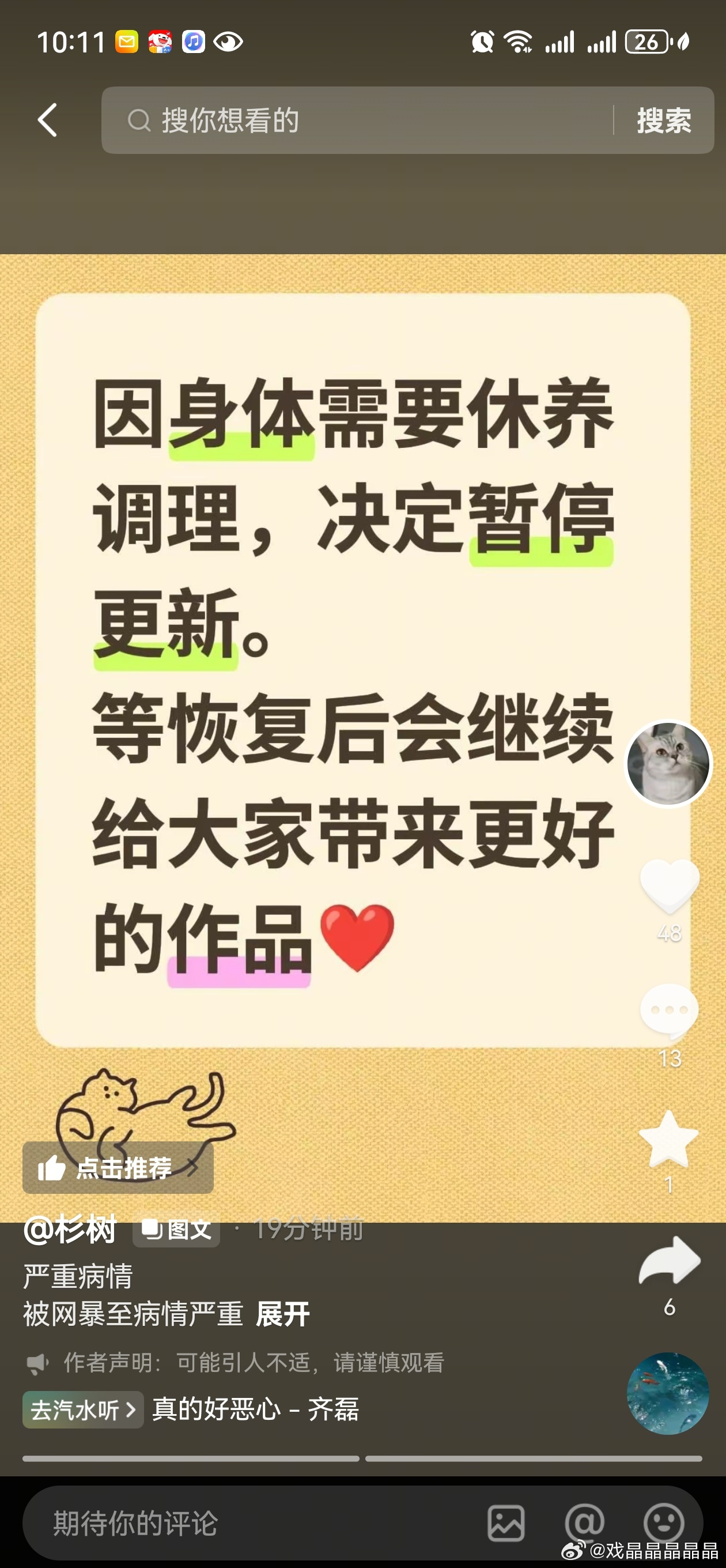 iejj把杉树网暴生病了,她决定退网一段时间,等恢复了再更新。