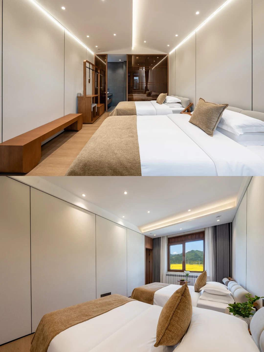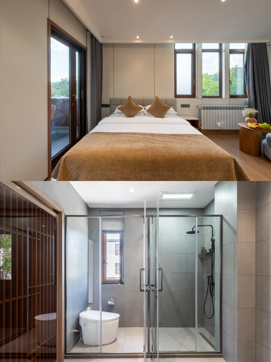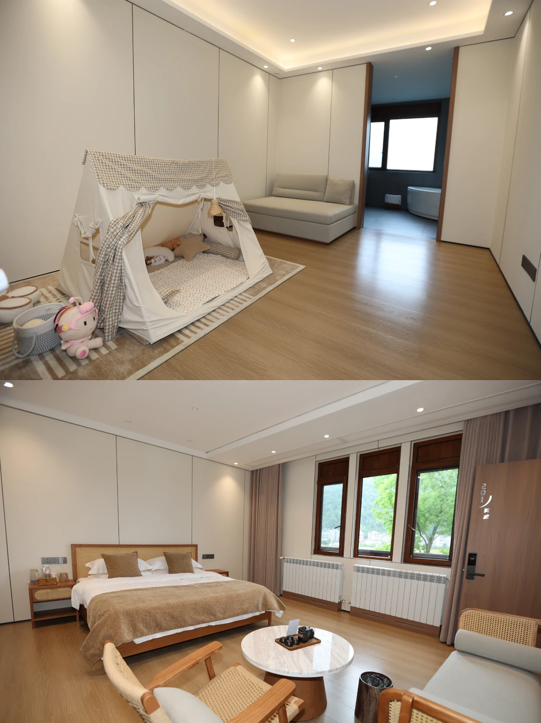 民宿是包栋6户的设计,一楼有客用厨房、超大客厅,带独立洗烘超方便。可以和家人在院子里喝茶看晨雾;早上睡到自然醒,推开窗就是满眼绿意。晚上一起在院子里烧烤、看星星,这种不用赶景点的假期,才是真正的陪伴。