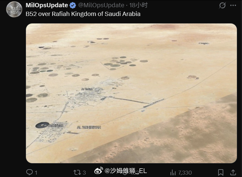 美国中央司令部的官方账号昨天发布了一张美军B-52轰炸机进行空中加油的照片,而评论区立刻定位出这里是沙特阿拉伯东部卡里亚特·乌利亚省的拉菲亚地区。