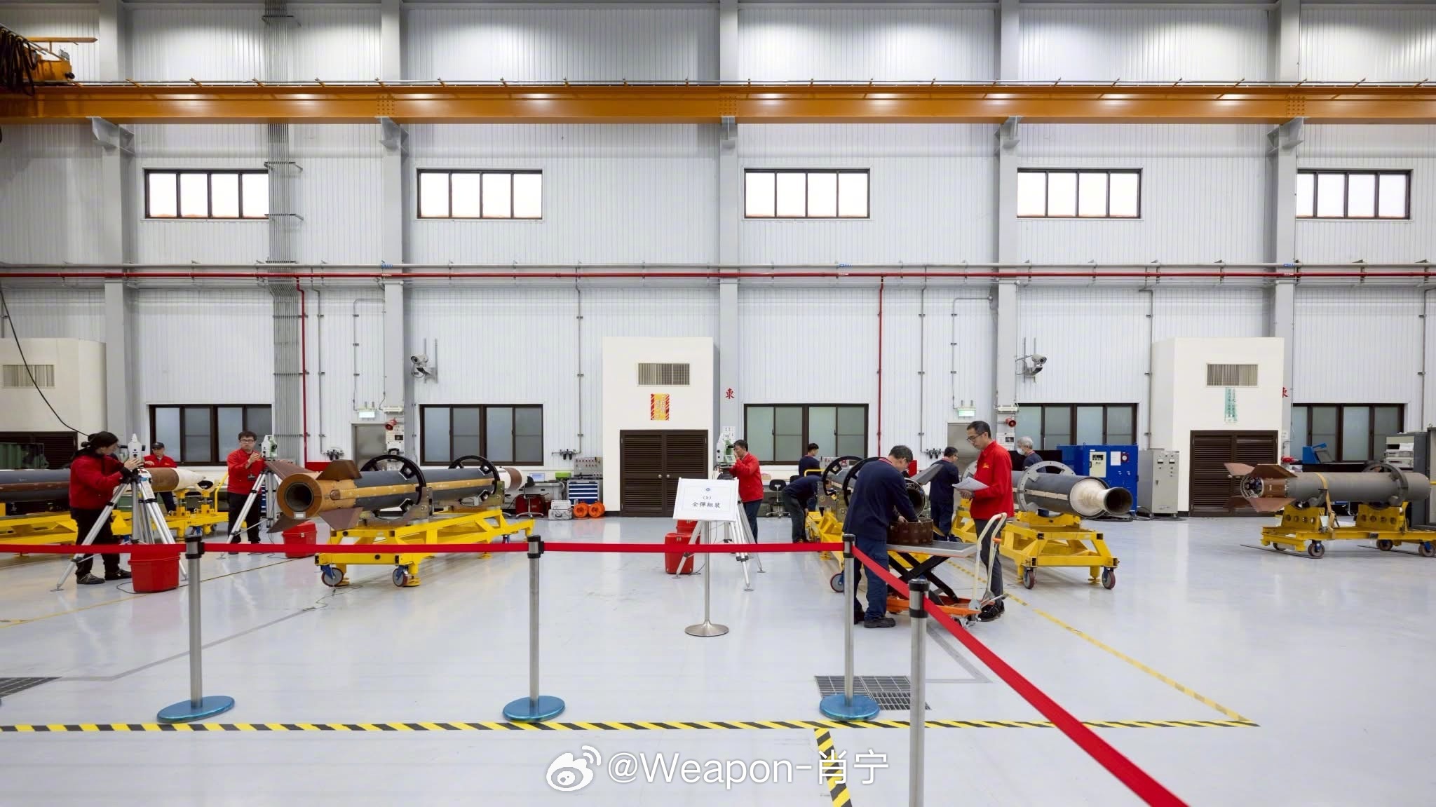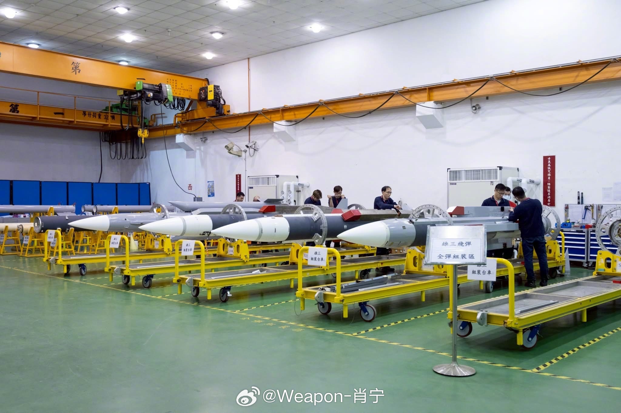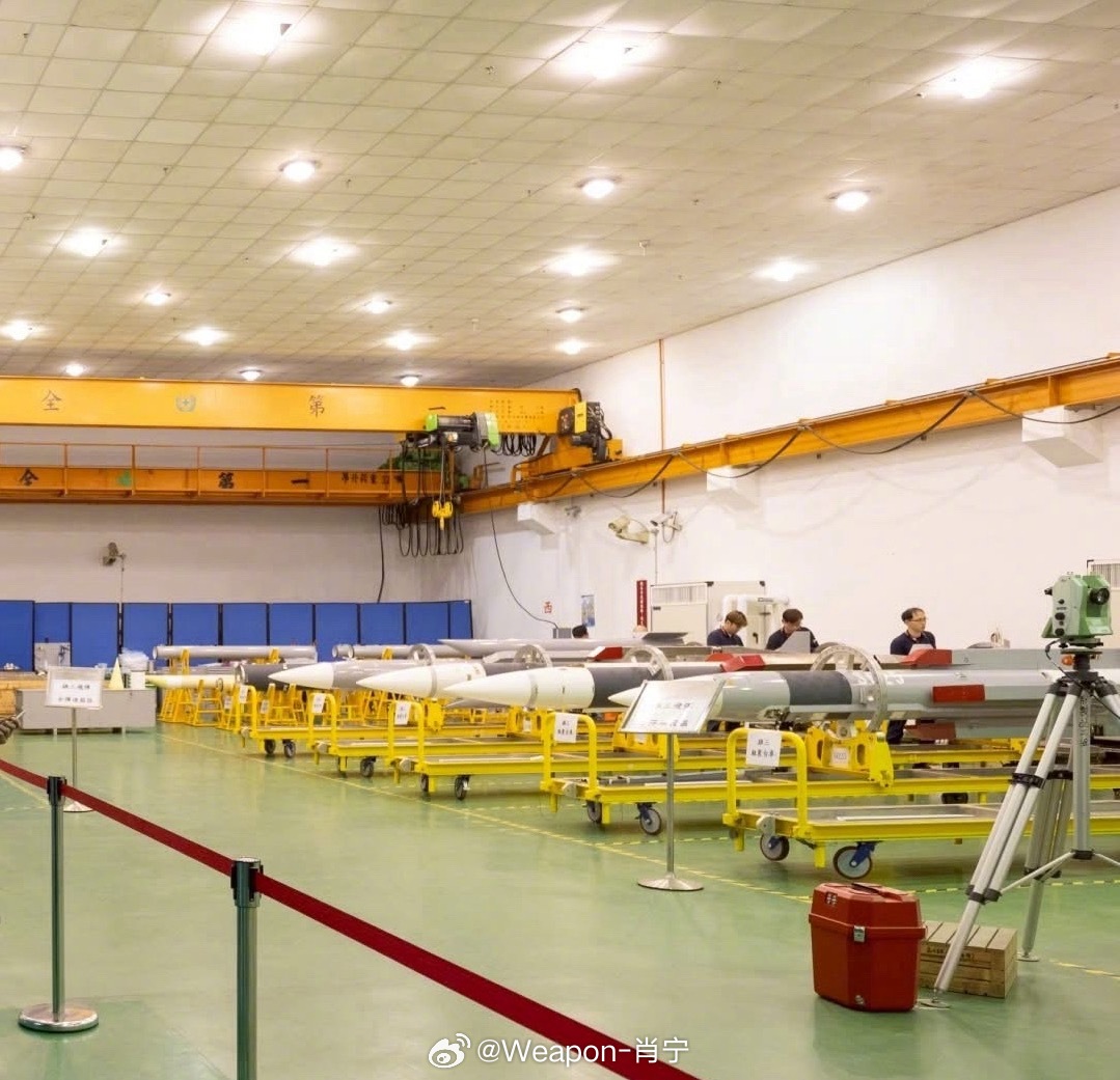 兵器影像 台伪“中科院”展示的强弓防空导弹系统(天弓四型)测试弹体及雄三、弓三导弹生产线。