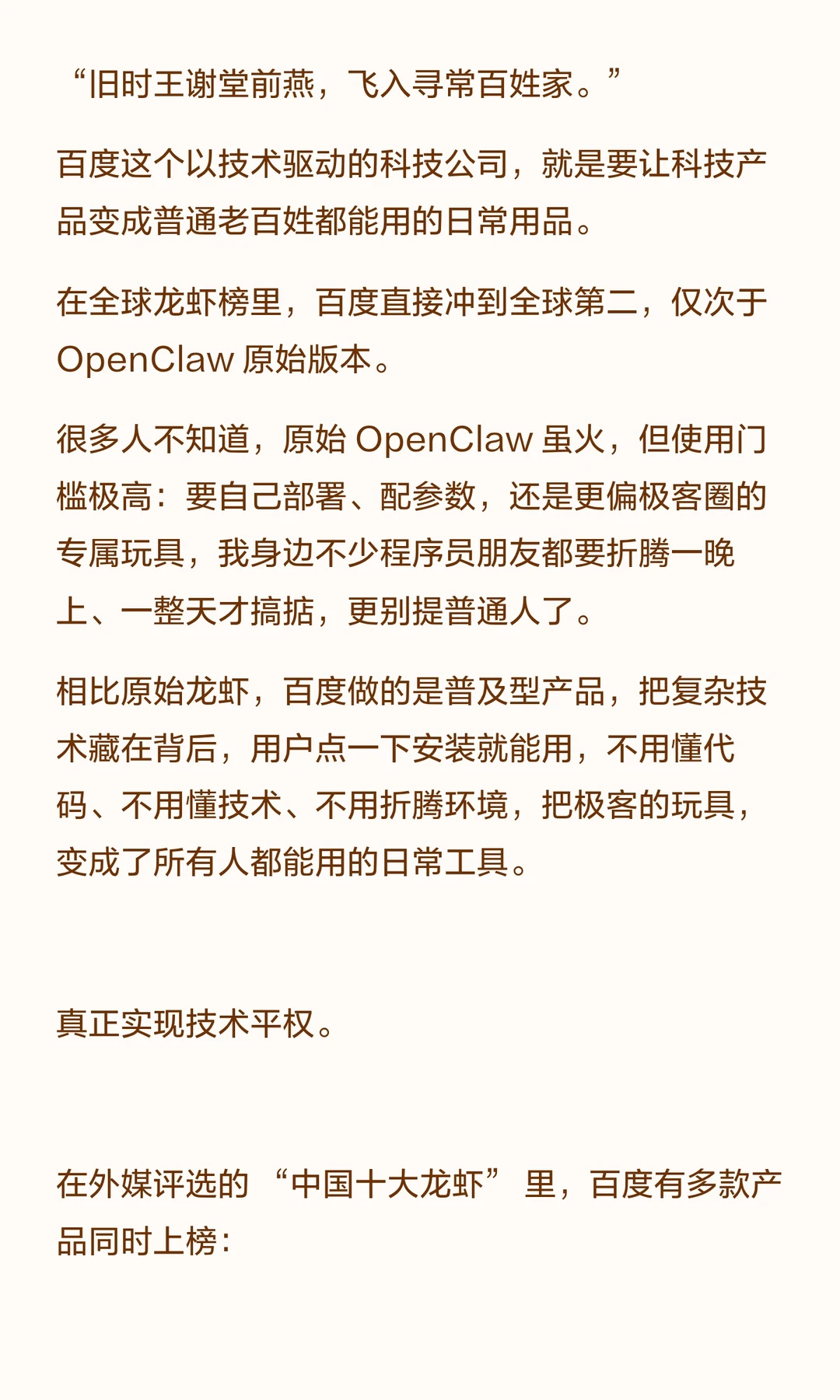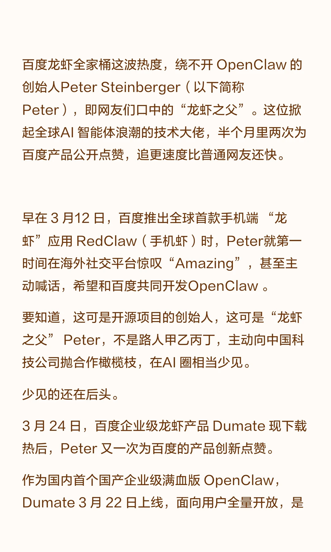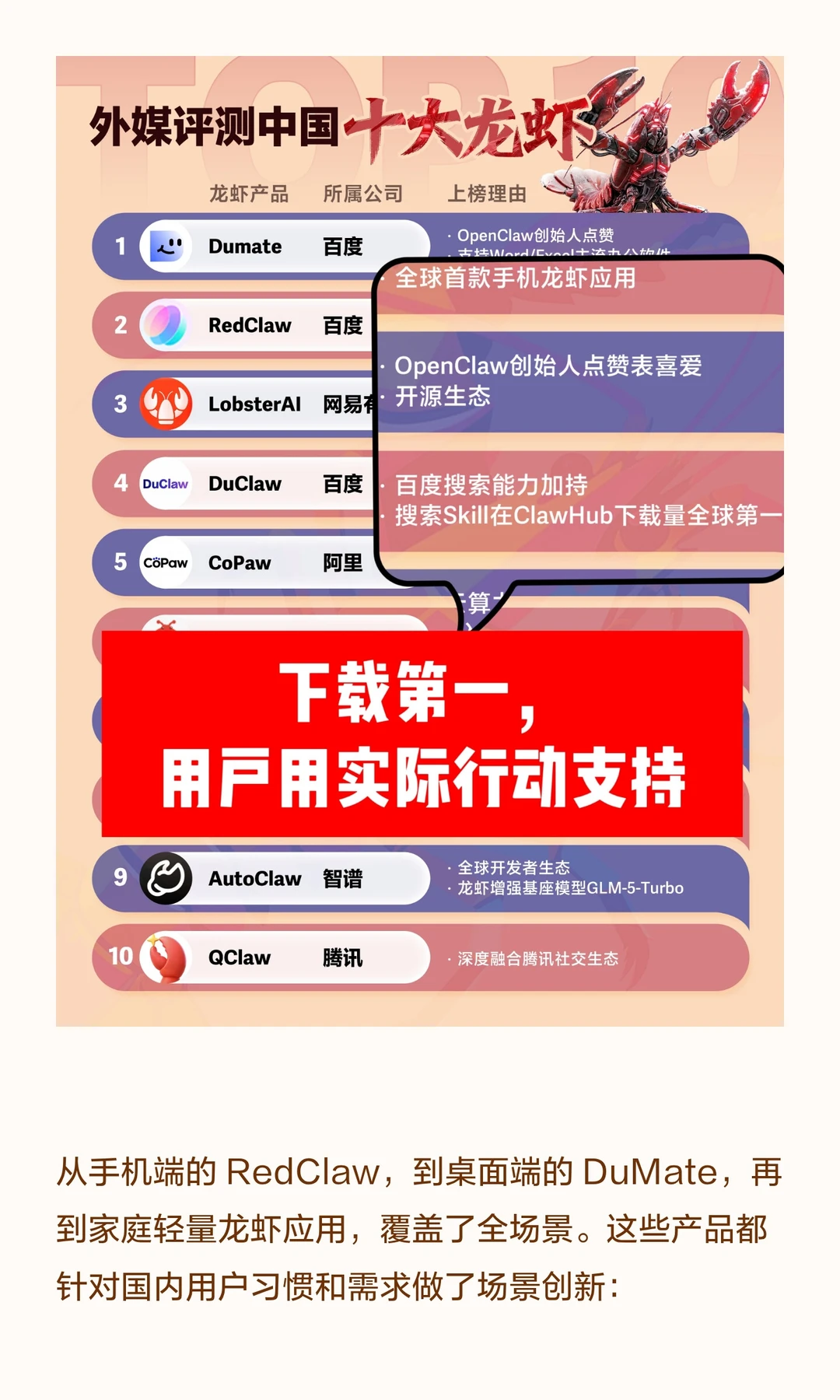 百度龙虾产品RedClaw、Dumate和DuClaw在海外获得“龙虾之父”Peter Steinberger多次点赞,全球龙虾榜和外媒中国龙虾榜双双认可。 这些产品覆盖手机、桌面和家庭场景,支持跨APP交互,数据安全有保障,真正实现技术平权,惠及大众。