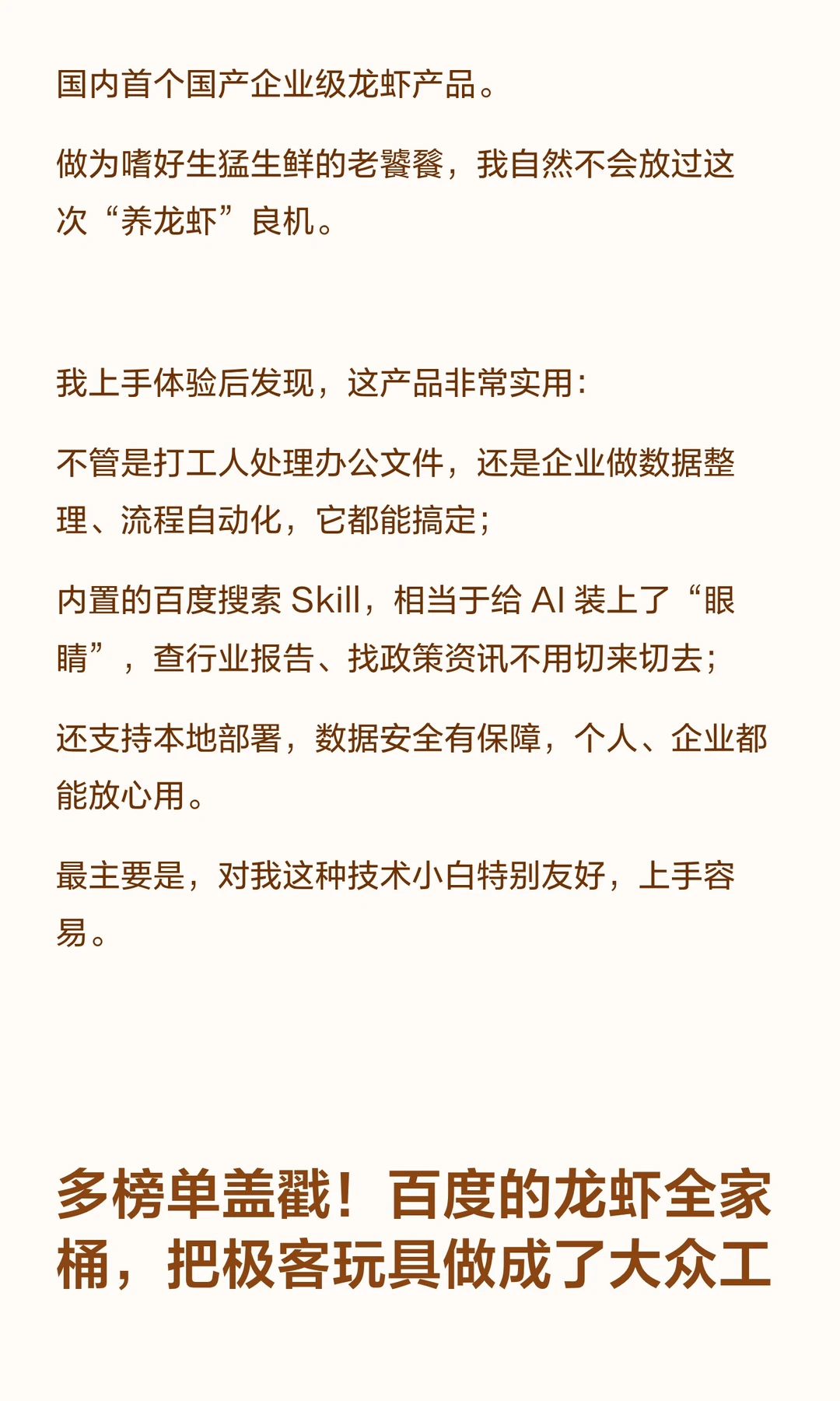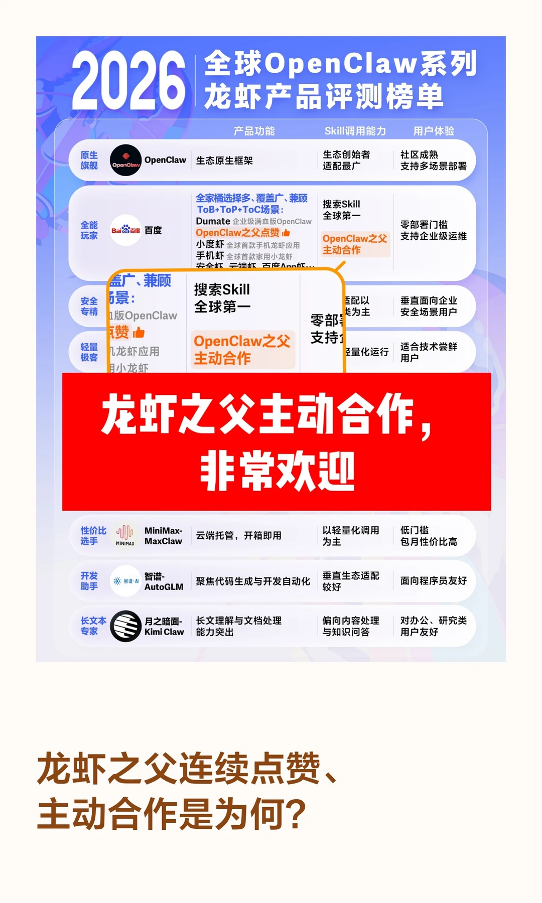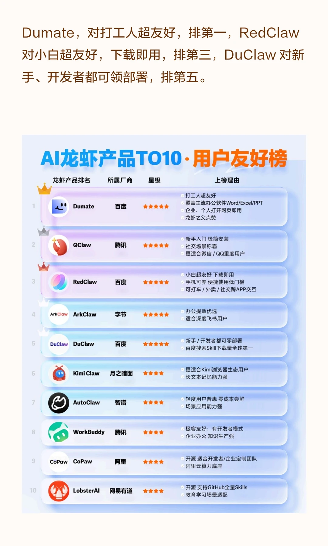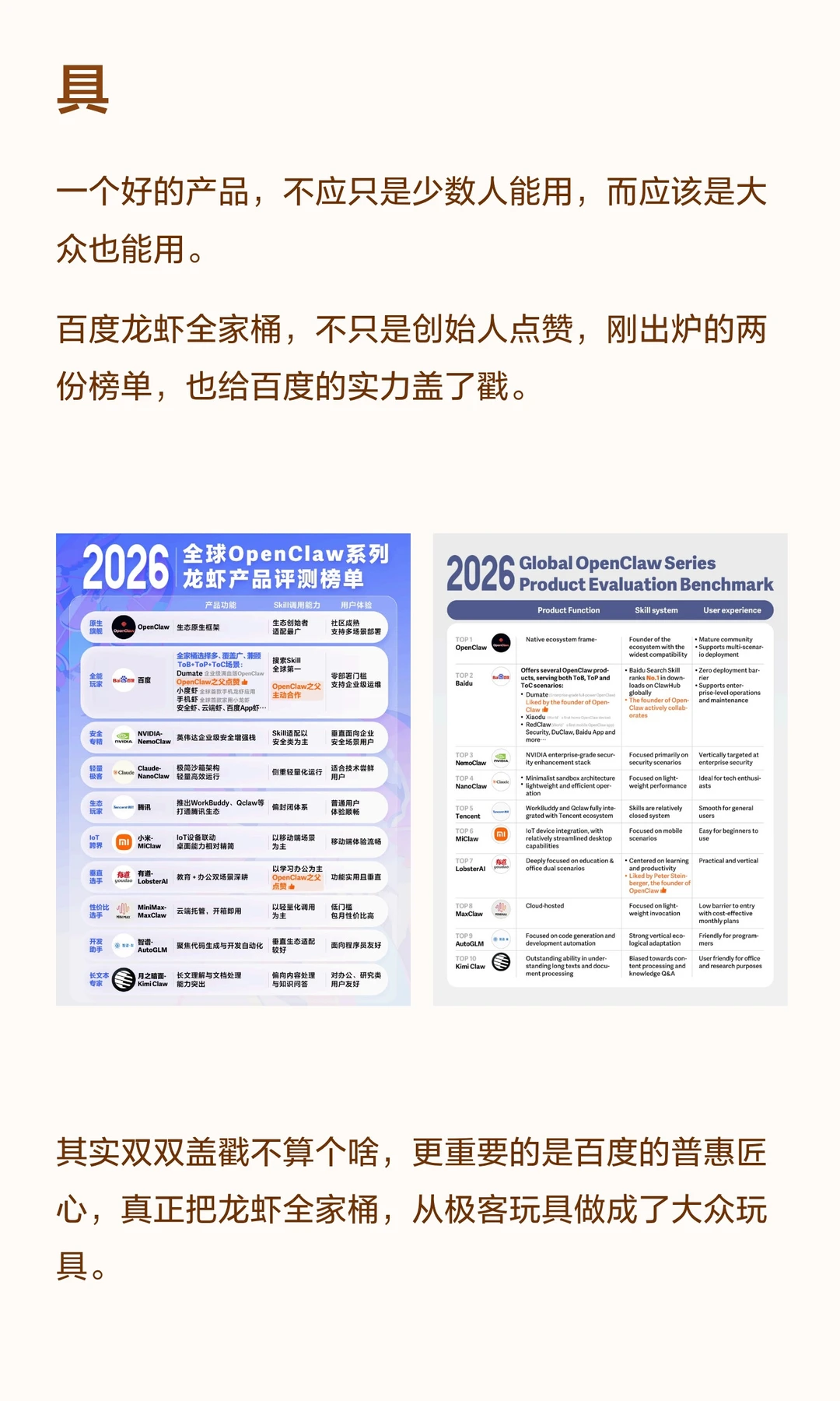 百度龙虾产品RedClaw、Dumate和DuClaw在海外获得“龙虾之父”Peter Steinberger多次点赞,全球龙虾榜和外媒中国龙虾榜双双认可。 这些产品覆盖手机、桌面和家庭场景,支持跨APP交互,数据安全有保障,真正实现技术平权,惠及大众。