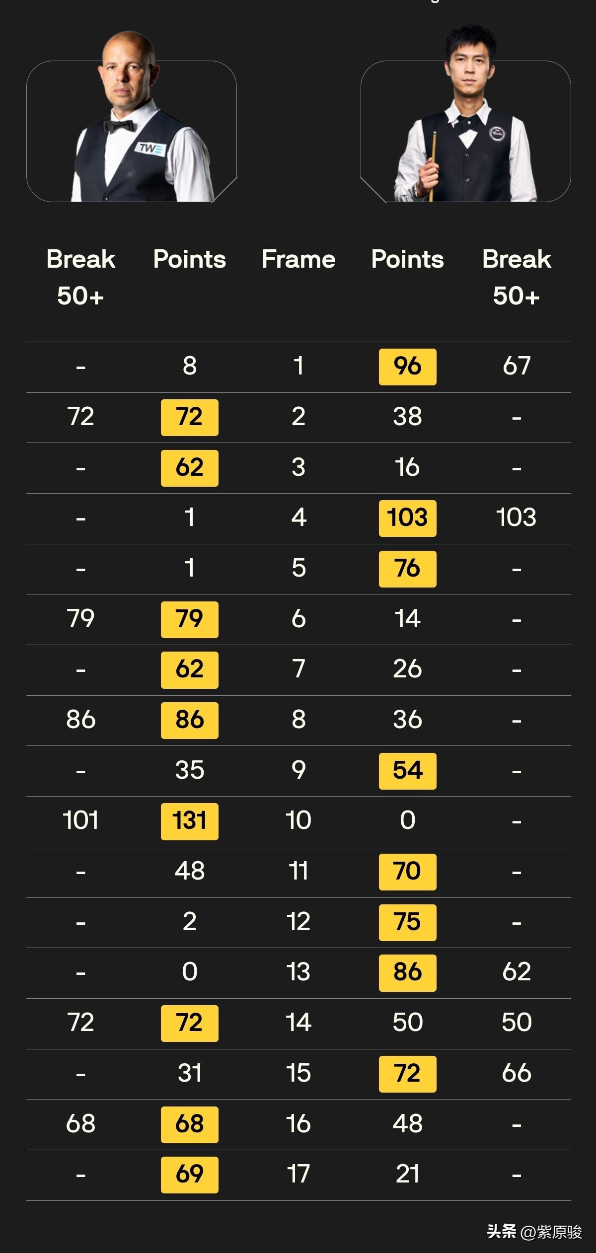 巡回锦标赛,霍金斯10-8战胜塔猜亚,晋级8强;希金斯6-2领先马克·威廉姆斯。明天凌晨2点,吴宜泽续战韦克林,希金斯续战马克·威廉姆斯,争夺8强席位。 霍金斯与塔猜亚的第一阶段比赛,霍师傅5-3领先。今天晚上进行的第二阶段,双方简单失误依然很多。总的看,霍金斯还是稍占上风,不过塔猜亚一度7-6反超比分,之后双方各胜一局,塔猜亚8-7领先。接下来霍金斯连胜两局,9-8率先拿到赛点。第18局,霍金斯超分致胜,总比分10-8晋级8强。霍金斯1/4决赛将迎战尼尔·罗伯逊。 塔猜亚虽然输了,但还是发挥了一定水平。由于球风和经验的原因,塔猜亚稳定性不够,简单失误太多。 今晚另一场比赛,卫冕冠军希金斯在0-2落后的情况下,抽了马克·威廉姆斯六连鞭,6-2领先结束第一阶段。 明天凌晨2点,吴宜泽将与韦克林进行第二阶段比赛,第一阶段吴宜泽6-2领先。同一时间,希金斯将续战马克·威廉姆斯,争夺8强席位。 吴宜泽,加油!