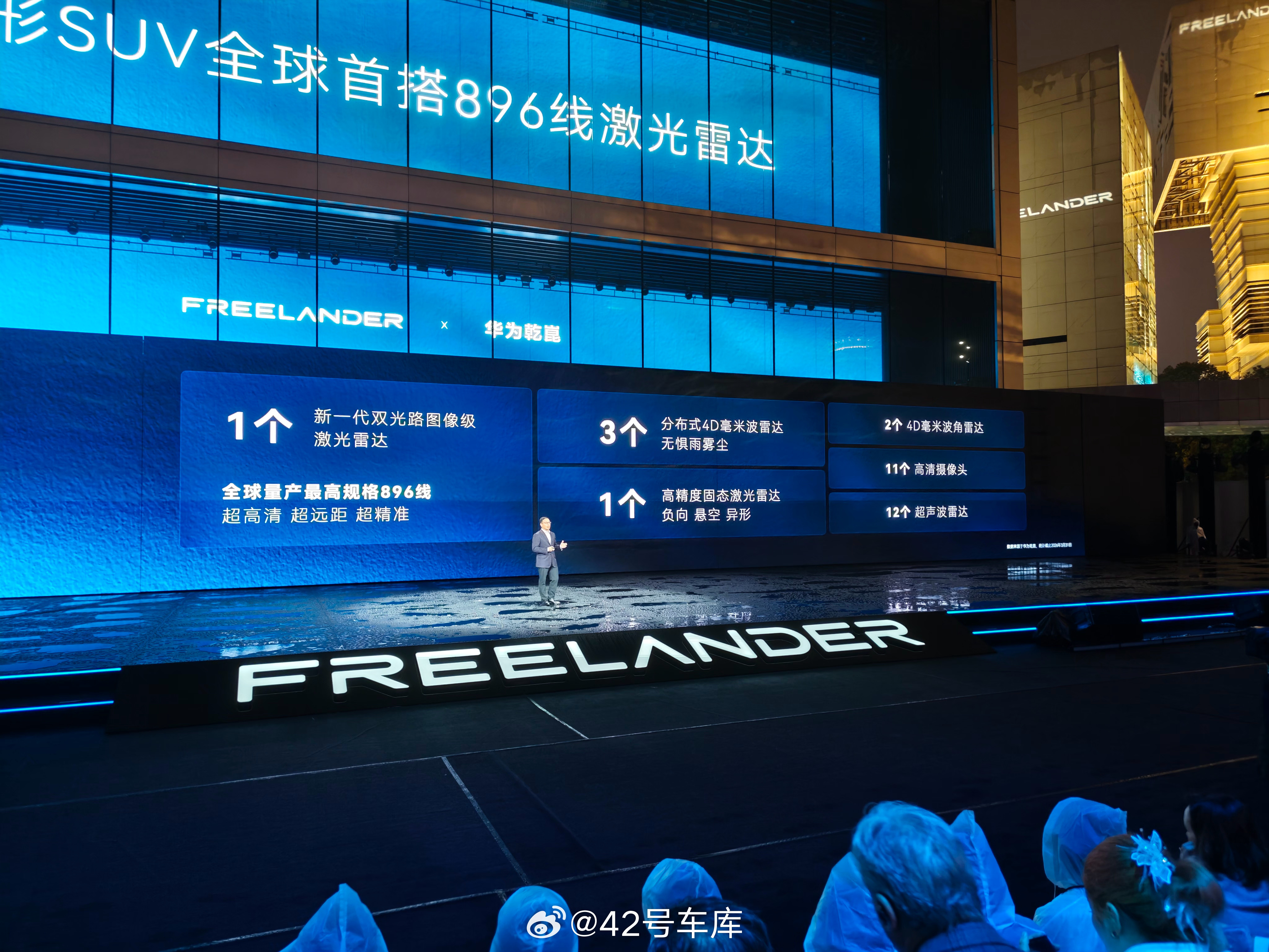 FREELANDER 发布会华为车 BU CEO 靳玉志介绍了首款车型的硬件:一颗 896 线激光雷达、一套三分布的 4D 毫米波雷达、两颗后侧向 4D 毫米波雷达、一个后向高精度固态激光雷达、11 个摄像头、12 个超声波雷达。