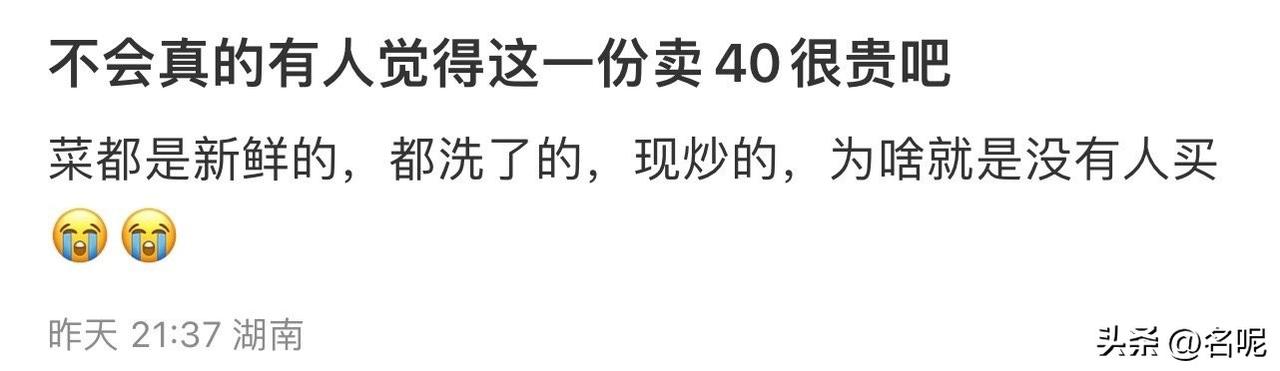 刷到一咨询,图片这样一份40很贵吗? 一看图片,一份西红柿炒鸡蛋+香菇肉片+青椒皮蛋,另一份是五香干肉片+青椒肉丝+青椒皮蛋 这菜,在火车上卖40,我都嫌贵。别提在别的地方了,最多15,还差山寨小饮料。 更绝的是,什么时候菜洗了,现炒都能成卖点了吗?这不是应该的吗? 你们觉得这菜值40吗?