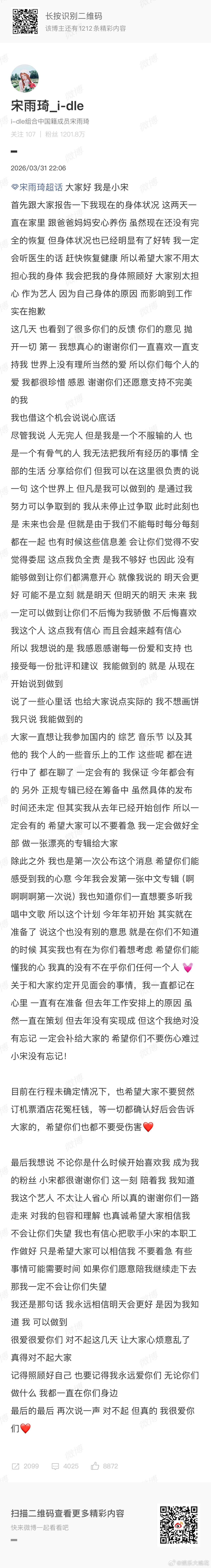 宋雨琦发长文回应近期争议宋雨琦发长文回应今年工作安排好真诚的妹宝,在养伤期间看到了大家的关心,一一回应。对于大家期待的各种工作安排也都在筹备~