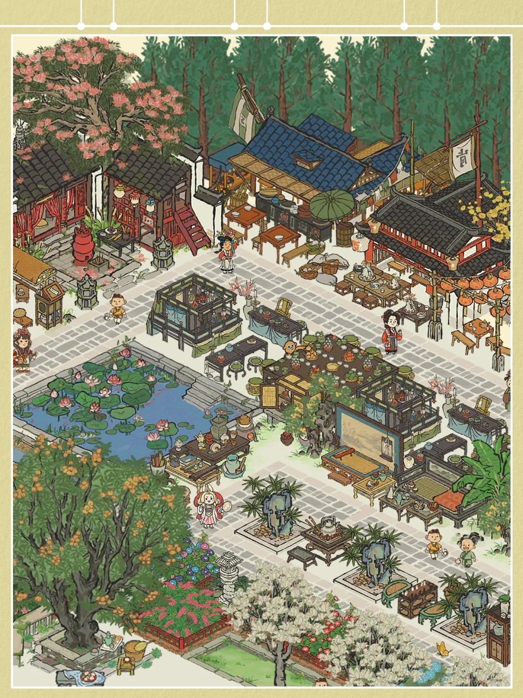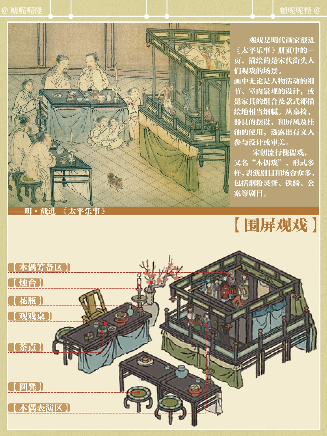 【围屏观戏】的原型出自明代戴进的《太平乐事》 观戏是明代画家戴进《太平乐事》册页中的一页,描绘的是宋代街头人们观戏的场景。 画中无论是人物活动的细节、室内景观的设计,或是家具的组合及款式都描绘地相当细腻。从桌椅、器具的摆设,和屏风及挂轴的使用,透露出有文人参与设计或审美。 宋朝流行傀儡戏,又名“木偶戏”,形式多样,表演剧目和场合众多,包括烟粉灵怪、铁骑、公案等剧目。