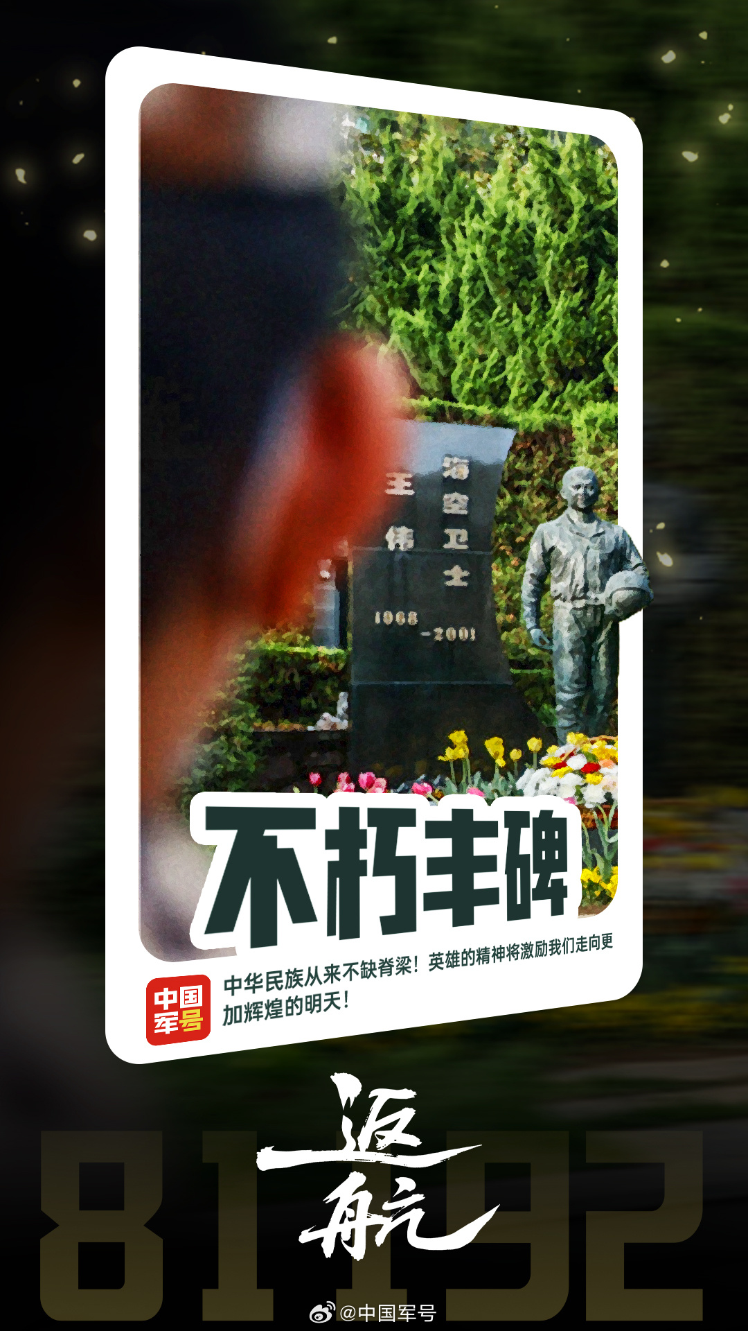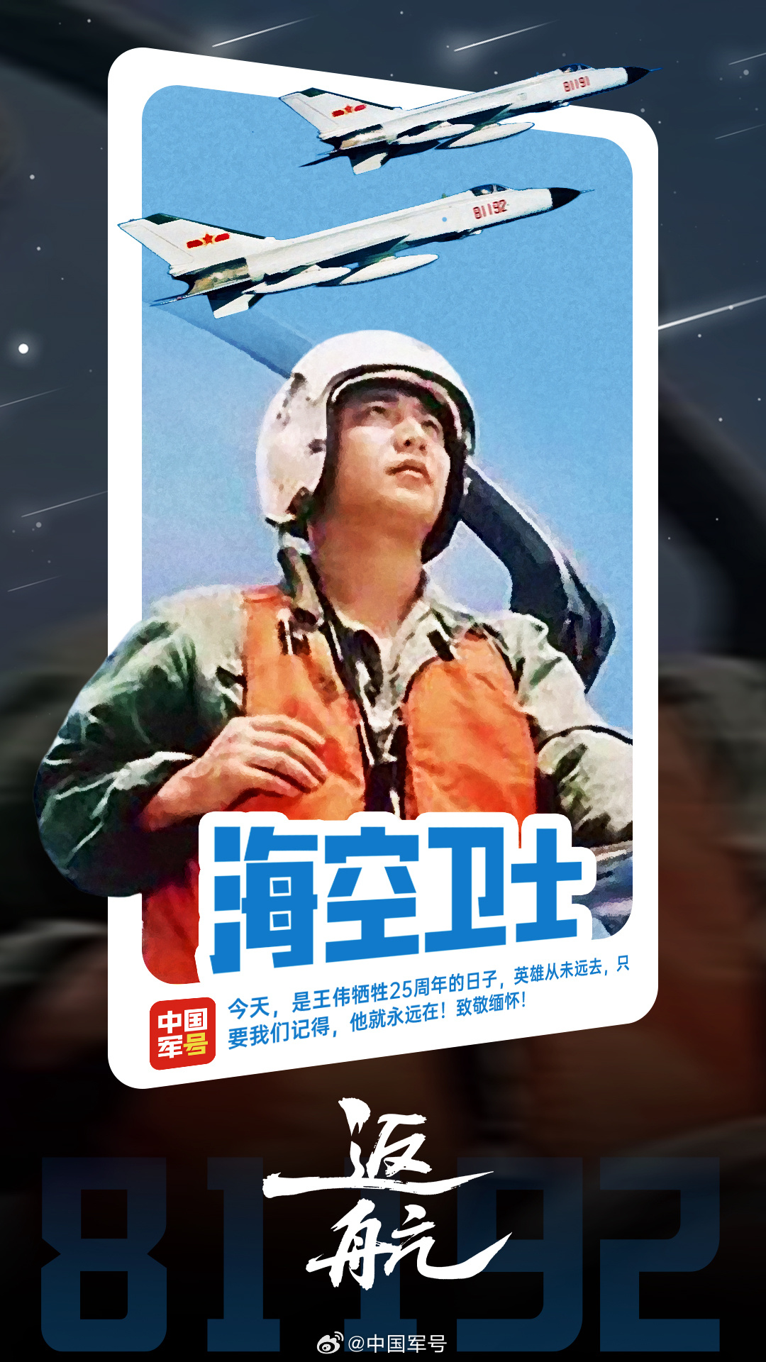 【81192我们永远记得】今天,是海军航空兵飞行员王伟牺牲25周年的日子。25年前,王伟驾驶歼-8Ⅱ战机,在捍卫祖国领空时壮烈牺牲。英雄从未远去,我们从未忘记那个编号,今天我们一起呼叫81192,缅怀,致敬!(郑童月)