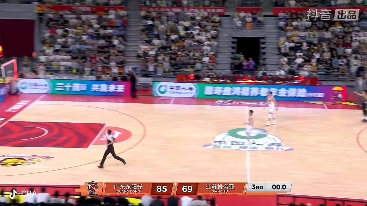 三节比赛结束!广东东阳光男篮依然领先! 在刚刚结束的广东东阳光男篮主场迎战江苏肯帝亚男篮的第三节比赛中,广东队暂时以85比69领先。 从前三节比赛中可以看到,广东队篮板领先,而且三分球全面开花,徐杰、胡明轩、奎因的三分球命中率非常高,萨姆纳也是有上佳表现。反观江苏队,贾尔斯表现太棒了!就是罚球不行呀!另外亨特和庞峥麟也是有精彩表现。 这场比赛看来肯定是主场作战的广东东阳光男篮最终取得胜利✌️!