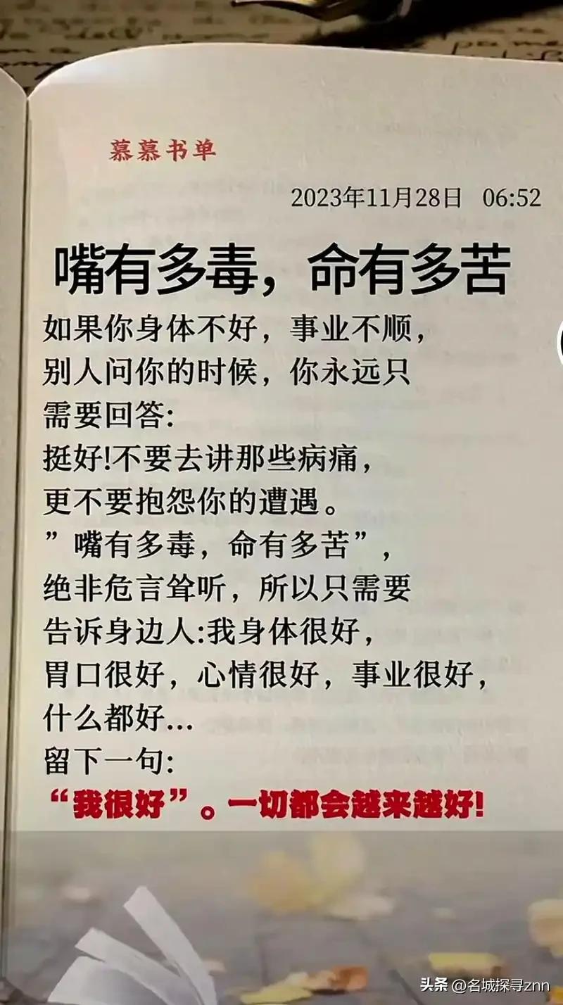最近很火的一段话:“你嘴有多松,命就有多苦,你话多,说明你蠢,你话很多,说明你很傻。说话只有三个目的,一是让人高兴,二是让人办事,三是让自己赚钱,如果都不是,请闭嘴。 这句话戳中无数人的软肋,不是因为刻薄,而是因为它道破了成年人世界最朴素的生存法则。说话是成本最低的沟通,也是最容易踩的坑,多少人的人生坎坷,根源都藏在没管住的嘴里。 李娟是一家国企的行政主管,在单位干了八年,资历够、人缘广,可偏偏管不住嘴。同事私下吐槽领导,她跟着附和,转头就把原话添油加醋传给领导; 部门项目有分歧,她不分场合当众反驳,丝毫不顾别人的面子;就连领导私下交代的内部消息,她转头就跟相熟的朋友闲聊,觉得“说两句又不碍事”。她总觉得自己心直口快是真诚,却没发现,身边的人慢慢都跟她拉开了距离。 领导对她日渐疏远,同事对她敬而远之,就连她负责的行政事务,也被悄悄移交了一部分。去年部门精简,她成了第一个被优化的人,拿着补偿金离开时,她才明白,那些随口而出的话,早已成了扎向自己的针。 和李娟形成鲜明对比的,是做建材生意的老周。老周在行业里摸爬滚打二十年,生意越做越大,有人问他生意经,他总说“全靠会说话”。但他的会说话,从来不是口若悬河,而是字字千金。 客户来谈合作,他不急于报价,先听需求,句句说到客户心坎里,从不随意承诺;同行有难处,他不随意评价,只在对方求助时给出建议,从不背后议论;就连家人之间,他也从不说伤人的话,凡事点到为止。 有一次,竞争对手故意散布他的产品质量有问题的谣言,他没有急着辩解,也没有当众反击,只是默默拿出检测报告,在行业交流会上客观陈述,既澄清了事实,又没让对方难堪。这场风波过后,客户更信任他,同行也对他心生敬佩,生意反而比之前更红火。 还有住在老小区的张阿姨,退休后最大的爱好就是串门聊天。起初她觉得自己热心肠,谁家有事儿都愿意掺和,谁家的长短都愿意打听。 邻居家孩子考不上高中,她劝人家“早打工早赚钱”,惹得人家夫妻大吵一架;邻居婆媳闹矛盾,她不分青红皂白帮着婆婆说话,让婆媳关系彻底破裂;就连小区里的公共事务,她也随意发表意见,引得邻里之间产生矛盾。 时间久了,没人愿意跟她说话,她走到哪里都被人避开,家里冷冷清清,她心里也越发憋屈。后来她听社区工作人员劝,试着少说话、多倾听,不再随意评价别人,慢慢的,邻居们又愿意跟她来往了,家里也恢复了往日的热闹。 生活里,像李娟、张阿姨这样嘴松话多的人不在少数。他们总觉得“话多是性格直爽”“心直口快没坏心眼”,却忽略了,说话的分寸,藏着一个人的人品,更藏着一个人的运势。 职场上,嘴松话多的人,容易泄露机密、得罪领导,错失晋升机会,甚至丢了工作;生意场上,嘴松话多的人,容易泄露商业机密、得罪客户,断了财路;家庭里,嘴松话多的人,容易引发矛盾、破坏关系,让家庭鸡飞狗跳;社交中,嘴松话多的人,容易被人当成谈资,被人利用,落得个孤立无援的下场。 反观那些过得顺遂的人,从来都不是话多的人。他们懂得“言多必失”的道理,知道什么时候该说,什么时候该听,什么时候该闭嘴。他们说话有分寸,做事有底线,不随意评价别人,不轻易泄露秘密,不随便承诺别人。他们把精力放在做事上,而不是说嘴上,用行动代替言语,用实力证明自己,反而赢得了尊重和认可。 说话是本能,闭嘴是本事。成年人的世界,从来都不是“说得越多,做得越好”,而是“说得越准,走得越远”。那些口无遮拦的话,那些无关紧要的话,那些伤人害己的话,只会消耗自己,拖累人生。 真正的聪明人,从不会让嘴巴成为人生的绊脚石。他们会管住自己的嘴,说该说的话,做该做的事,把精力放在提升自己、经营生活上。毕竟,人生的好坏,从来都不是由嘴决定的,而是由管住嘴的分寸,和做事的态度决定的。 各位读者你们怎么看?欢迎在评论区讨论。