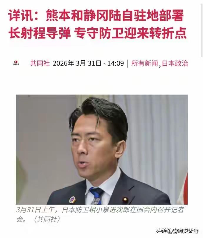 日本不再藏了,导弹对准中国,随时开火! 它要打第一枪了! 3月31日,日本防卫省在熊本、静冈两地部署远程导弹。防卫大臣小泉进次郎亲口宣布:只要日本“觉得”对方要动手,就能直接发射导弹打击对方。 “觉得”就能开火——这不是防卫,这是强盗逻辑。从这一天起,“专守防卫”的规矩被彻底踩碎,日本堂而皇之地拥有了先发制人的能力,以及发动侵略战争的借口。 一千公里射程的导弹,从日本本土就能覆盖中国沿海核心区域。日本海上自卫队的舰艇已具备搭载“战斧”巡航导弹的能力,射程超过1600公里。这些导弹瞄准的不是什么“潜在威胁”,而是中国的领土、中国的城市、中国的安全底线。 日本人给这套说辞起了个名字叫“对敌基地攻击能力”。翻译过来就是:我怀疑你要打我,所以我先把你炸了。这哪里是自卫?这分明是侵略者的逻辑。 更讽刺的是,就在不久前,日本现役军官还敢持刀闯入中国驻日大使馆;日本政客公然将“台湾有事”与日本存亡挂钩。如今导弹落地,野心终于露出了真面目。 日本右翼势力早就等这一天了。美国智库这些年没少“授意”——让日本先动手。如今导弹到位,理由有了,靶子也找好了。下一步呢?是想借“反击”之名,行攻击之实? 日本民众不傻。熊本健军驻屯地门口,抗议者举着“不需要导弹”的标语,怒斥“这是令人愤怒的一天”。但防卫省连一场居民说明会都懒得开。军国主义的老路,从来不需要民意同意。 3月31日,记住这个时间,日本亲手撕掉了“专守防卫”的遮羞布。 从这一天起,日本不再是一个“和平国家”,而是一个拥有了“第一击”权限的武装实体。这枚对准中国的导弹,炸开的不只是和平宪法的空壳,更是整个东亚的稳定根基。 历史会记住这一天——日本再次迈出了主动战争的第一步!