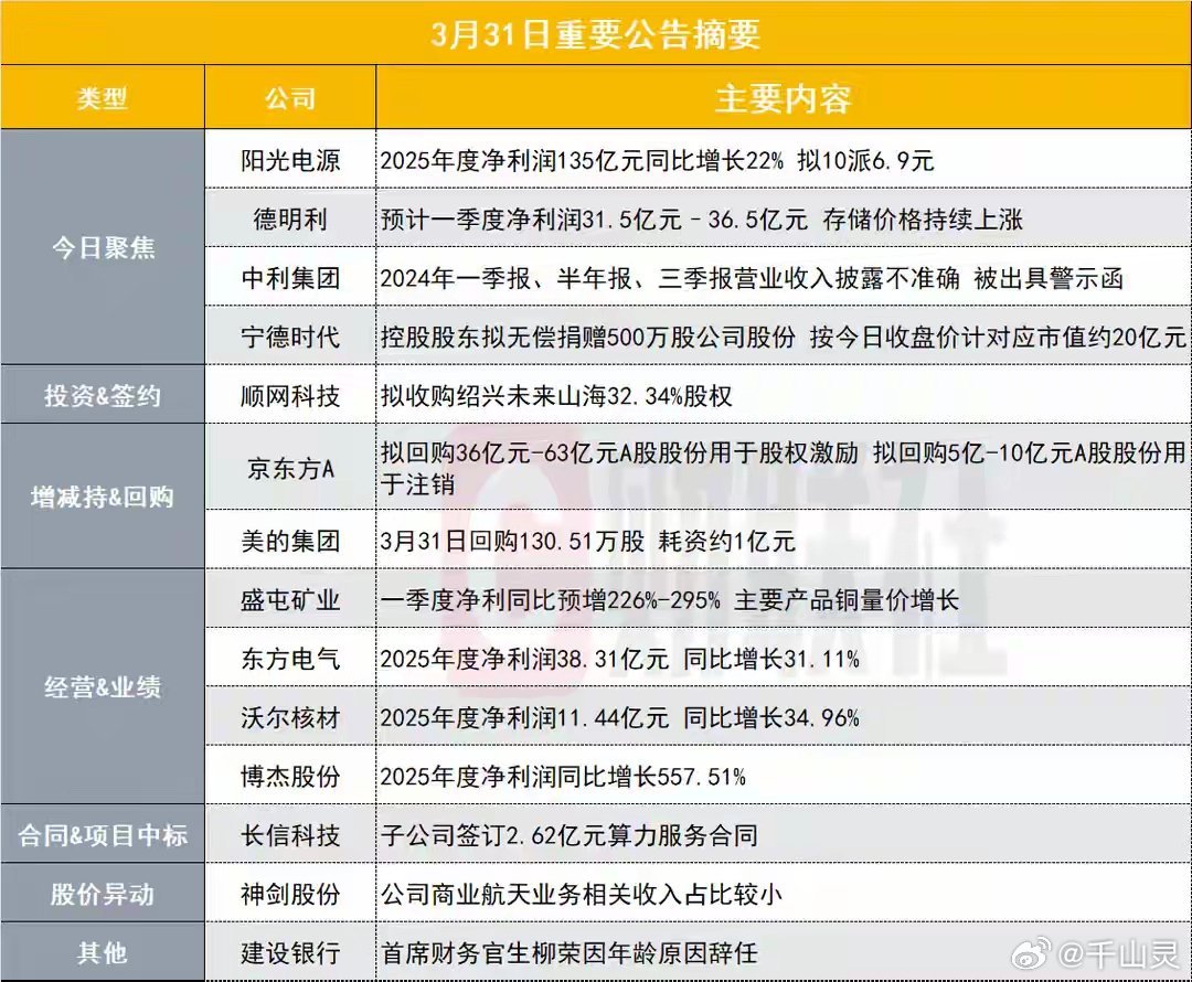 一、 业绩炸裂:光伏与新能源巨头喜报1. ☀️ 阳光电源(300274):2025年净利135亿(+22%),营收891亿。Q4单季净利15.8亿,环比下降62%,需留意季度增速放缓风险,拟10派6.9元。2. ⚡ 东方电气(600875):2025年净利38.31亿(+31.11%),业绩增长强劲。3. 💊 云南白药(000538):2025年净利51.53亿(+8.51%),分红大方,10派15.83元。4. 🏠 方大特钢(600507):2025年净利9.42亿,同比大增280%,弹性极大。二、 回购与增持:大厂真金白银护盘1. 🏠 美的集团(000333):今日耗资1亿元回购130万股,态度积极。2. ✈️ 春秋航空(601021):控股股东提议回购3亿-5亿元,用于维护股东权益。3. 📺 京东方A(000725):拟斥资36亿-63亿回购,同时包含B股注销与股权激励,力度空前。三、 业绩预增:存储与金属周期爆发1. 💾 德明利(001309):Q1预计净利31.5亿-36.5亿,上年同期亏损6900万,受益于存储价格大涨。2. ⛏️ 盛屯矿业(600711):Q1预增226%-295%,主要产品铜量价齐升,Q1预计环比增265%以上。四、 资本运作:大额捐赠与控制权变更1. 🔋 宁德时代(300750):控股股东拟无偿捐赠500万股,市值约20亿元,用于支持教育基金。2. 🧴 两面针(600249):实控人变更为广西国资委,4月1日复牌。五、 风险警示:这些“妖股”要远离(重点!)公告密集提示风险,提醒股友们切勿高位接盘:1. 🚀 神剑股份:连续2板异动,澄清商业航天收入占比仅0.3%,股价严重背离基本面,风险大。2. 🌊 平潭发展:连续2日异动,提示股价严重背离基本面,市盈率近600倍,注意风险。3. 🕊️ 法尔胜:连续3日异动,澄清不涉及光纤、不借壳,且预计2025年净利亏损,警惕炒作。六、 项目与合同1. 🔋 海亮股份:子公司拟投50.5亿建6.75万吨铜箔项目,加码新能源材料。2. 🏗️ 平高电气:合计中标国家电网约12.23亿元采购项目,利好特高压产业链。💡 老规矩,点赞关注,明天盘中继续解读机会!